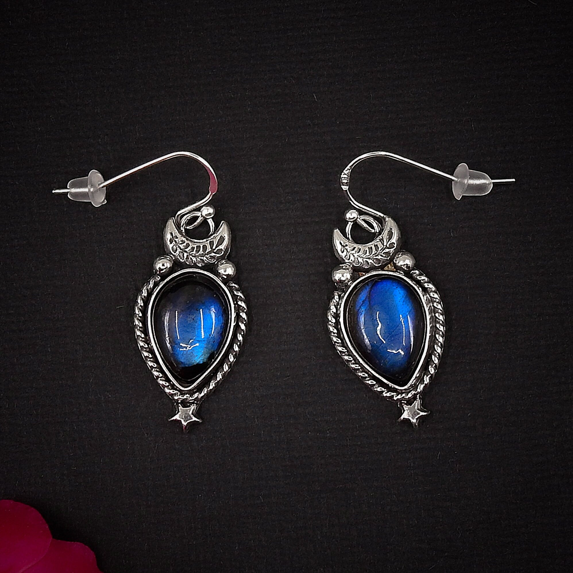 These handcrafted statement earrings are a piece from part 2 of The Midnight Meadow; a jewellery collection inspired by a midnight sky over fields of green, illuminated by the magical glow of the moon and stars above. This particular pair features two beautiful pieces of teardrop shaped Labradorite, filled with stunning blue flashes that shimmer across the stones in the light. Like all my work, these earrings are a complete one of a kind, made using recycled silver, cruelty-free materials, ethically sourced stones and environmentally friendly methods.