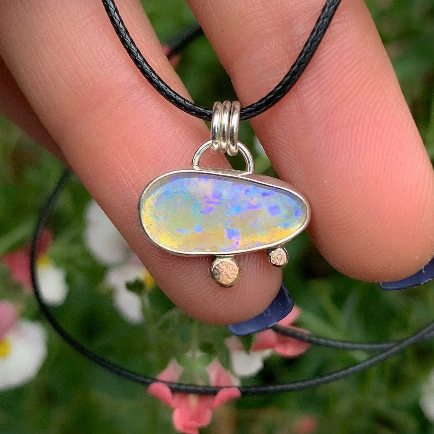 This handcrafted pendant is a piece from the Aurora collection, inspired by all the shimmering crystals that evoke images of twilight skies, the wings of faeries and rainbows that fill my garden after a sunshower. This particular design features a beautiful solid Australian Crystal Opal, with delicate flashes of colour that sparkle when the light hits the stone. Like all my work, this pendant is a complete one of a kind, made using recycled silver, cruelty-free materials, ethically sourced crystals and environmentally friendly methods.
