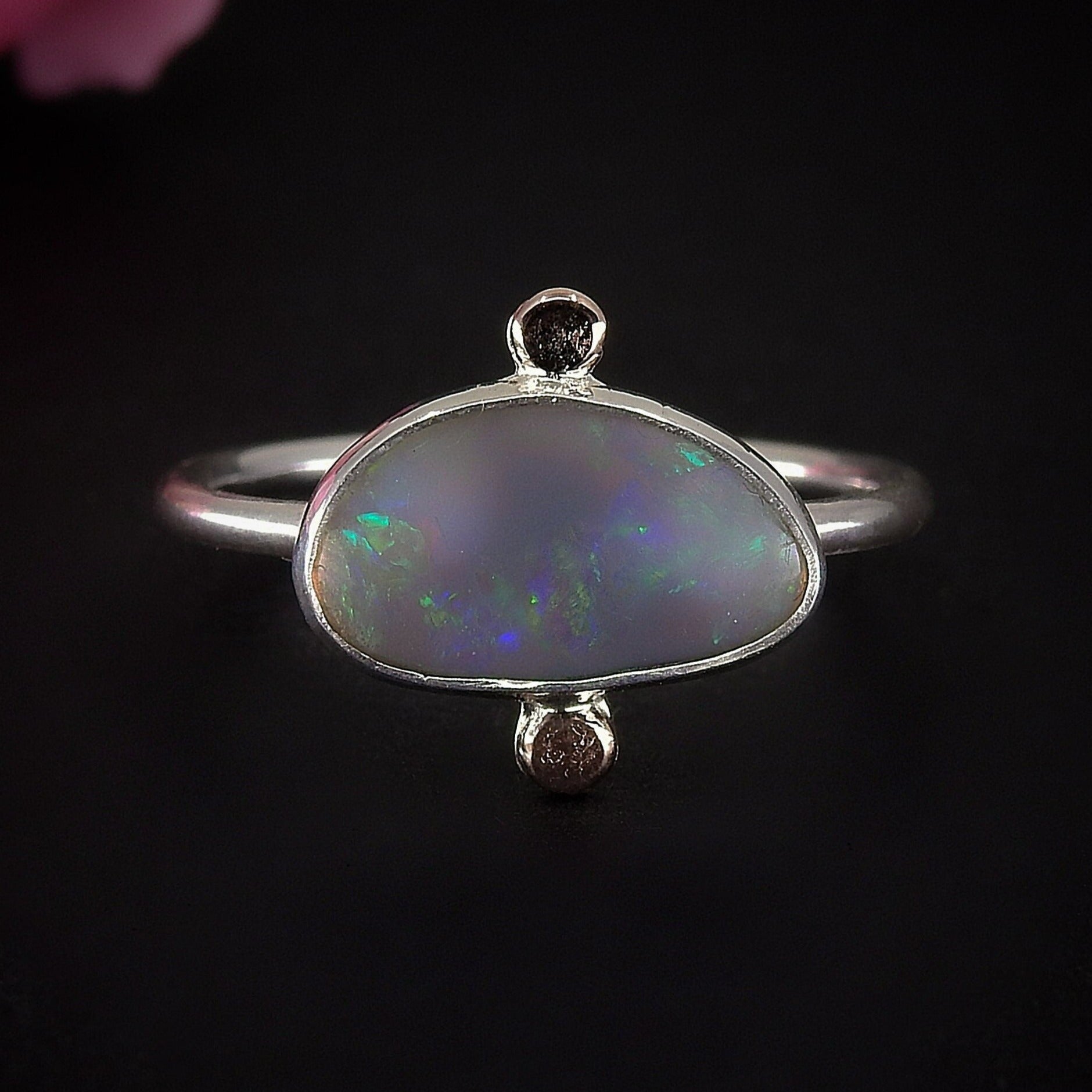 This handcrafted ring is a piece from the Aurora collection, inspired by all the shimmering crystals that evoke images of twilight skies, the wings of faeries and rainbows that fill my garden after a sunshower. This particular design features a beautiful solid Australian Crystal Opal, with delicate flashes of colour that sparkle when the light hits the stone. Like all my work, this ring is a complete one of a kind, made using recycled silver, cruelty-free materials, ethically sourced crystals and environmentally friendly methods.