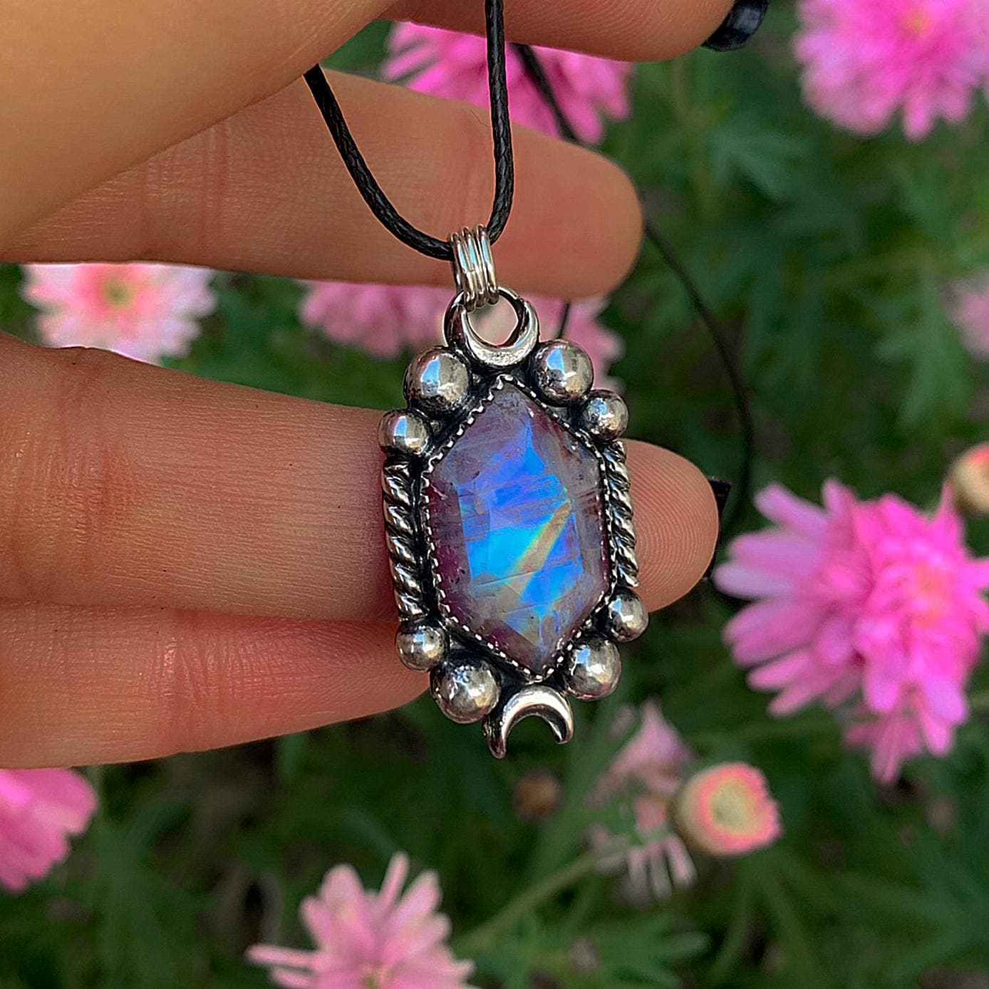 What a striking piece this is; I am so in love and haven’t taken it off since it arrived. Elle is so professional and friendly and chatted to me several times to let me know about shipping as there was a postal strike in place at the time of purchase. I couldn’t be more pleased with how shiny and colourful it is. The moonstone has such a unique shape and the color changes depending on the light. I will be wearing this for years to come. Highly recommend buying ANY item from this shop as it’s all authentic and the craftsmanship is amazing.
