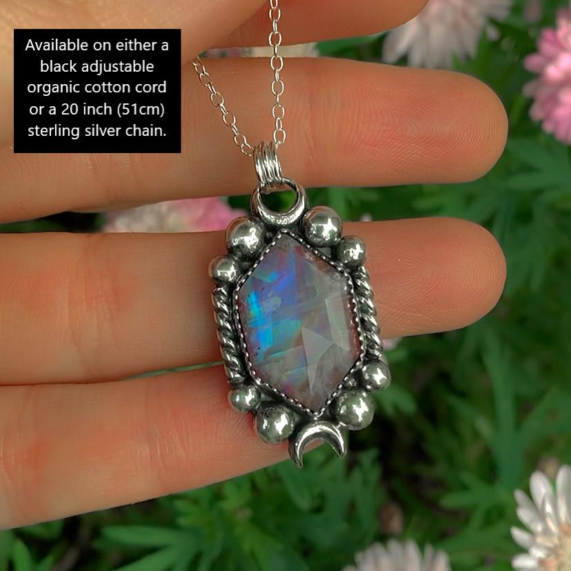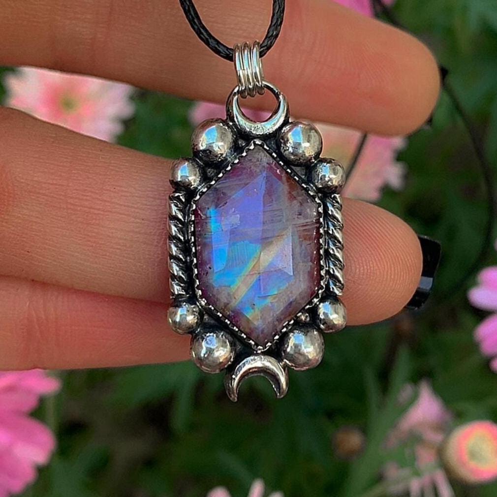This handcrafted pendant is a piece from the Aurora collection, inspired by all the shimmering crystals that evoke images of twilight skies, the wings of faeries and rainbows that fill my garden after a sunshower. It features a beautiful piece of rose cut Moonstone that sits above beautiful slice of Red Jasper, allowing the red colour of the Jasper to shine through and compliment the blue adularescence of the Moonstone. Like all my work, this pendant is a complete one of a kind, made using recycled silver, cruelty-free materials, ethically sourced crystals and environmentally friendly methods.