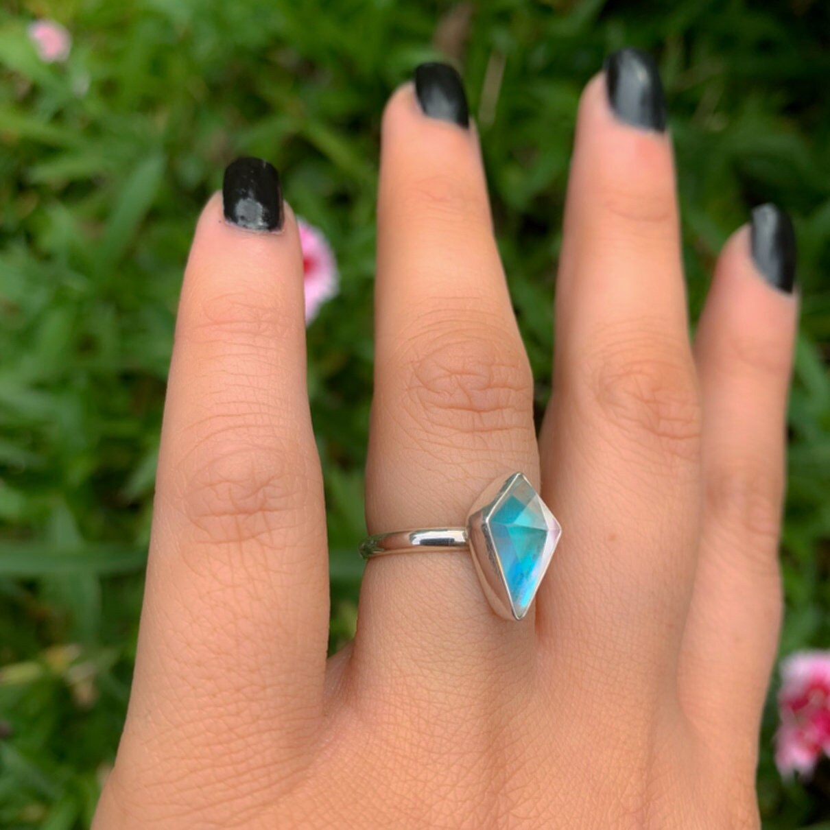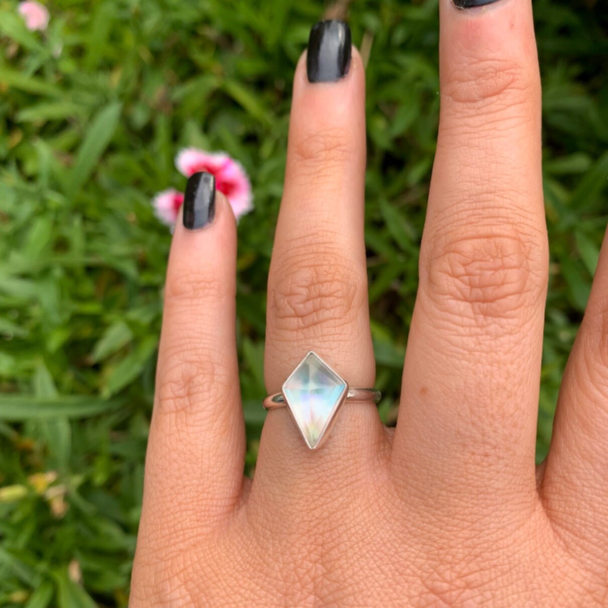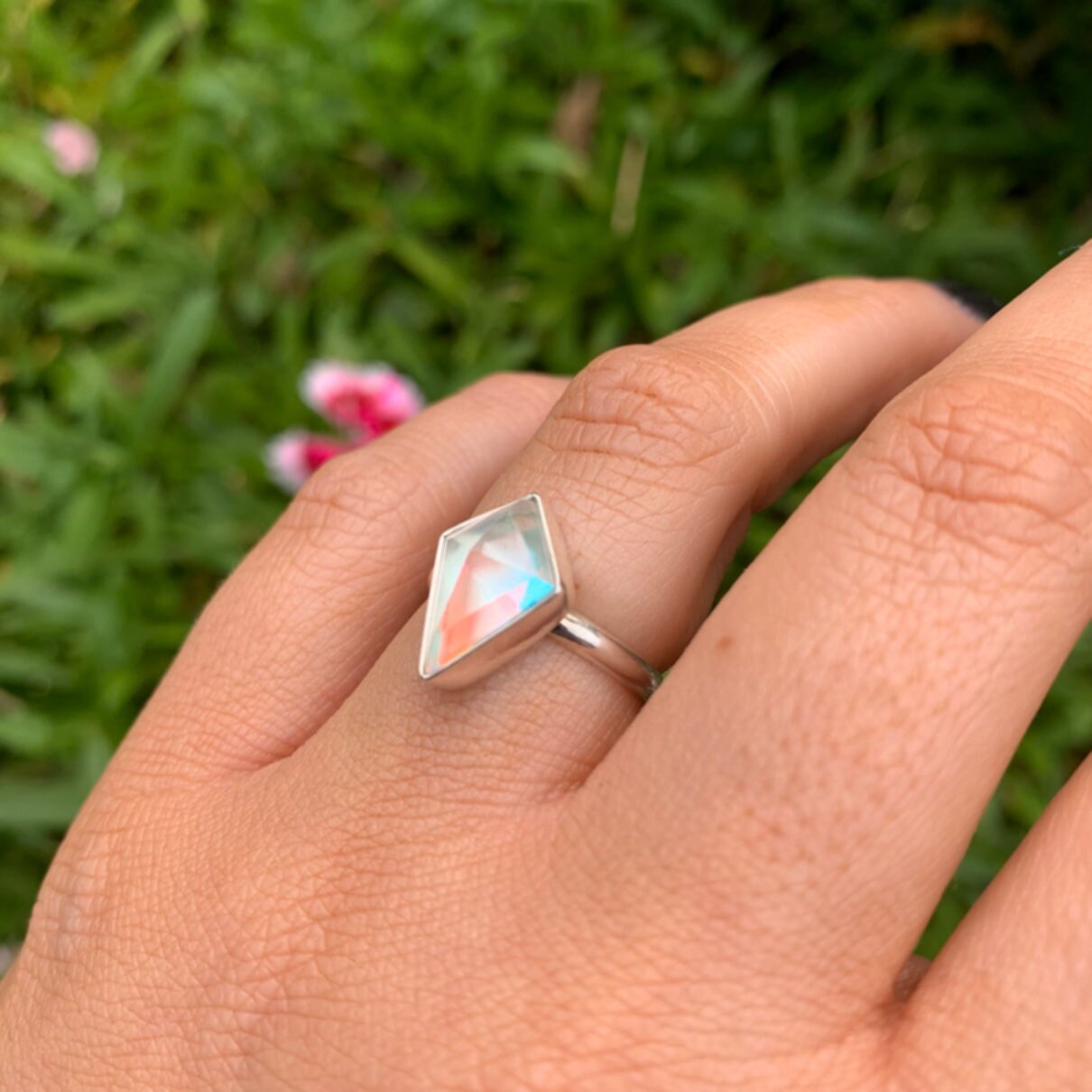 This handcrafted ring features a beautiful piece of diamond shaped faceted Angel Aura Quartz, with the loveliest rainbow that shimmer across the stone when it moves. Like all my work, this ring is a complete one of a kind, made using recycled silver, cruelty-free materials, ethically sourced crystals and environmentally friendly methods.