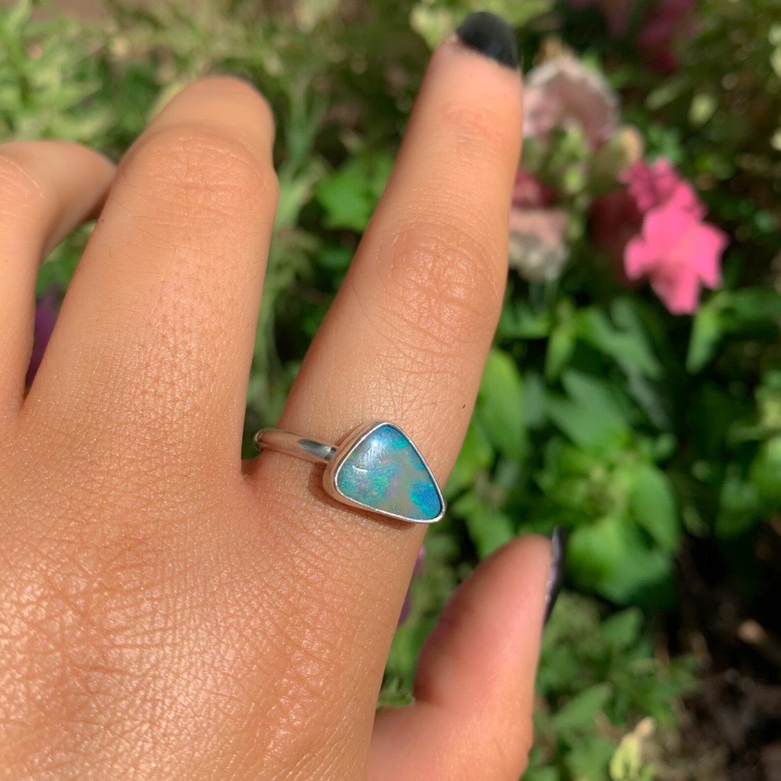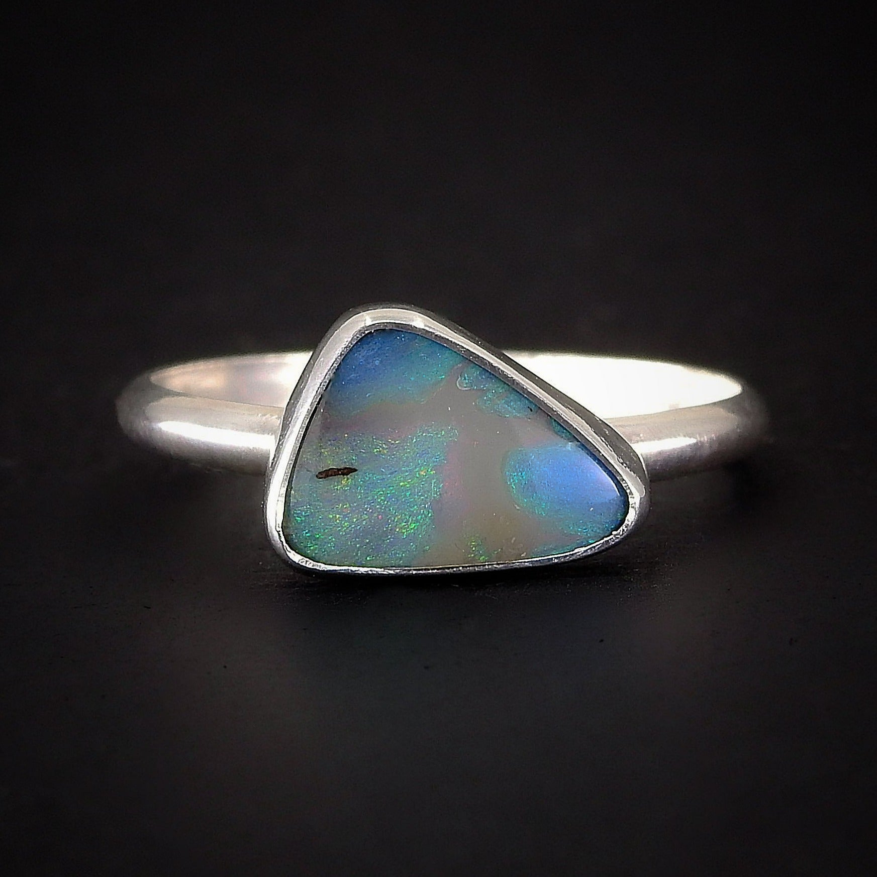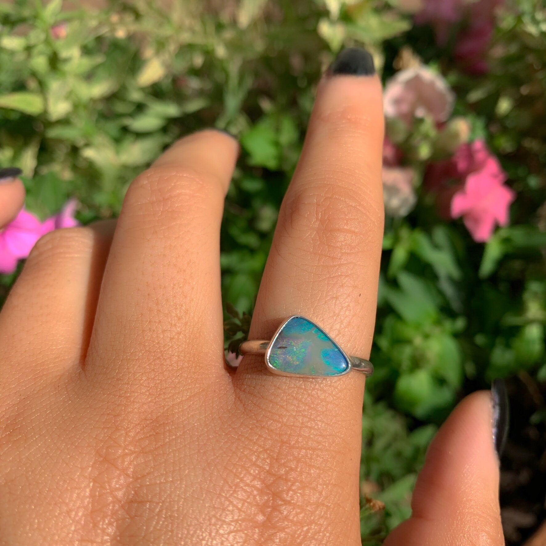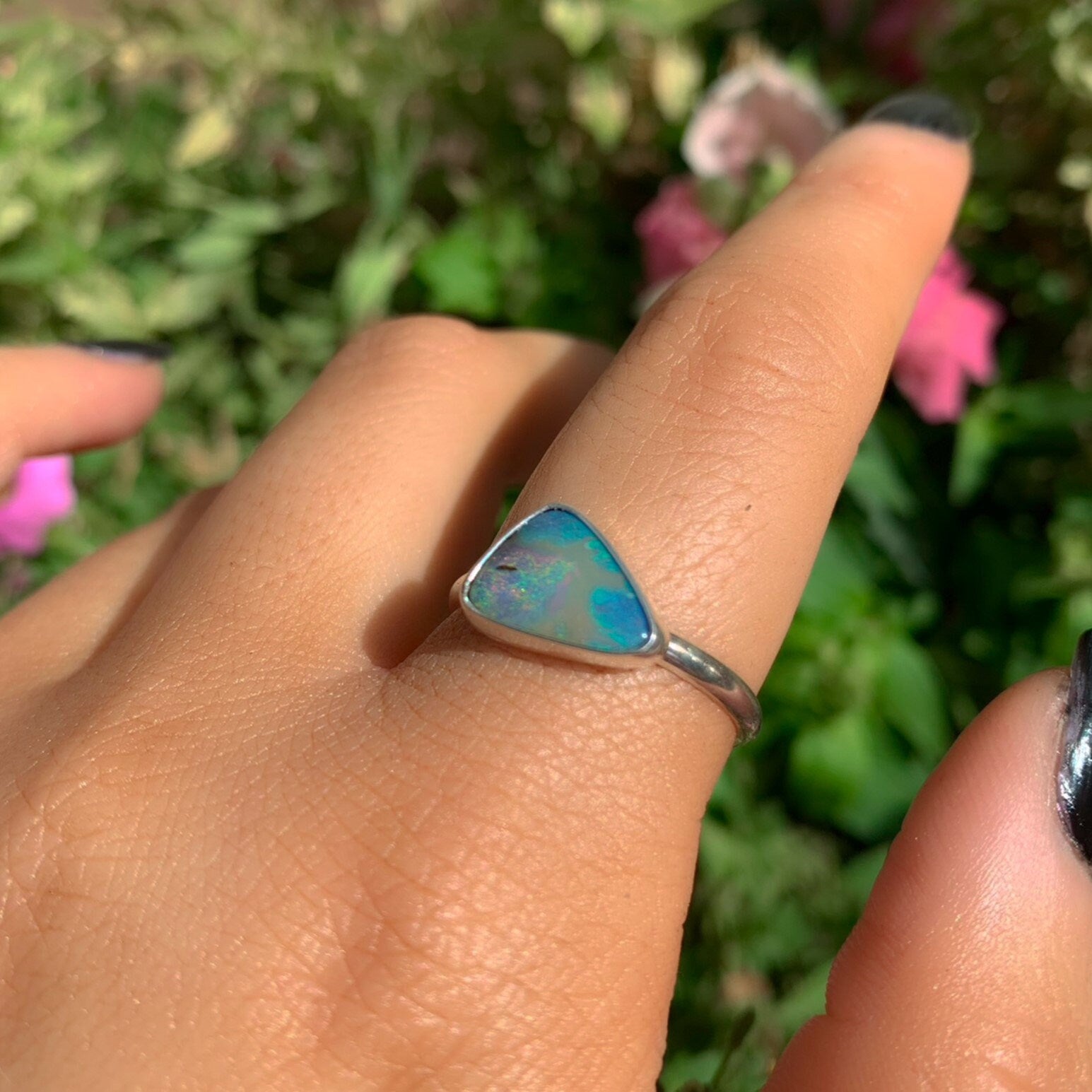 This handcrafted ring features a beautiful solid Australian Boulder Opal, filled with delicate flashes of colour that sparkle when the light hits the stone. Like all my work, this ring is a complete one of a kind, made using recycled silver, cruelty-free materials, ethically sourced crystals and environmentally friendly methods.