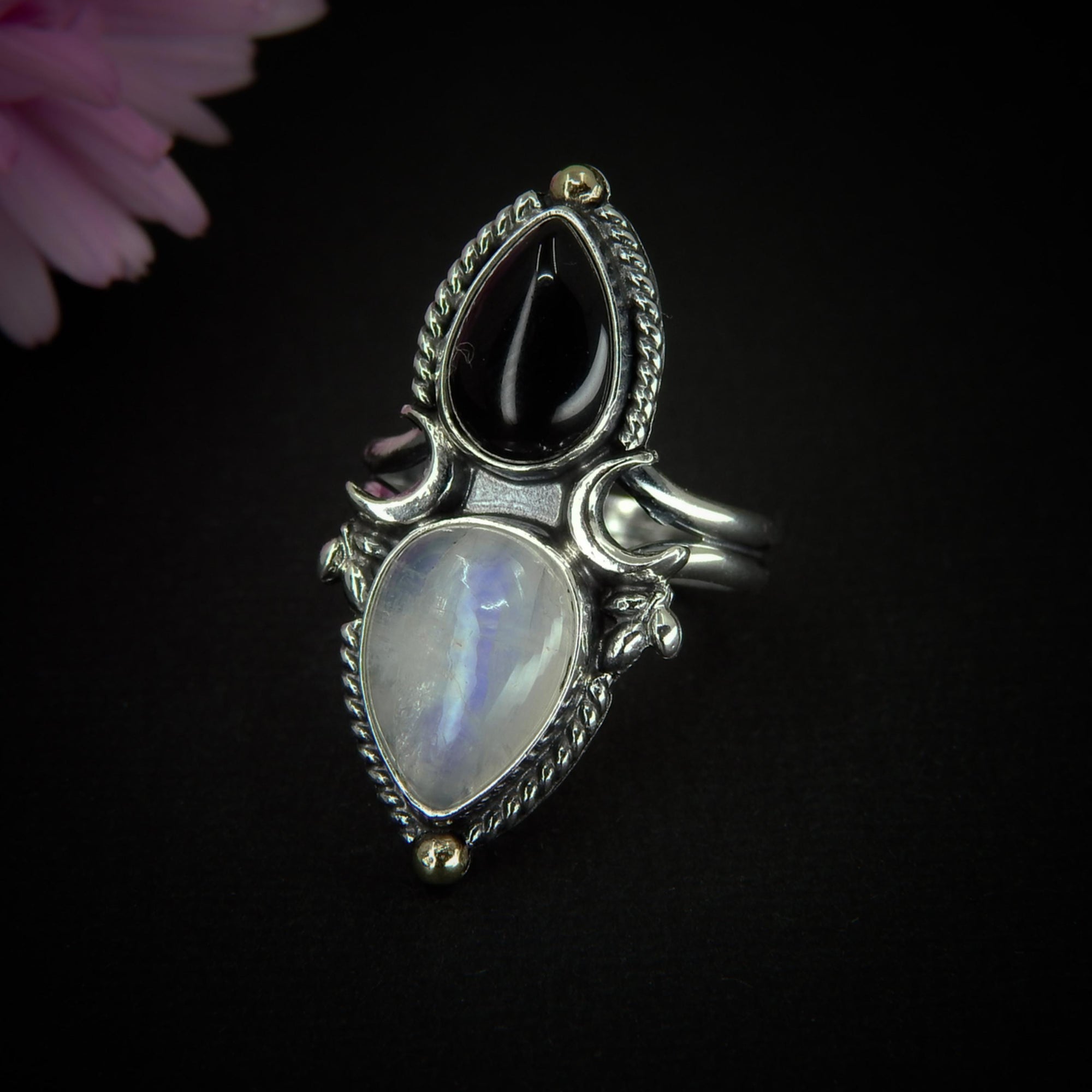 This handcrafted ring features a luminous Black Onyx, paired with a shimmering rose cut Moonstone filled with the most incredible flashes of blue. Like all my work, it is a complete one of a kind, made using recycled silver, cruelty-free materials, ethically sourced stones and environmentally friendly methods.