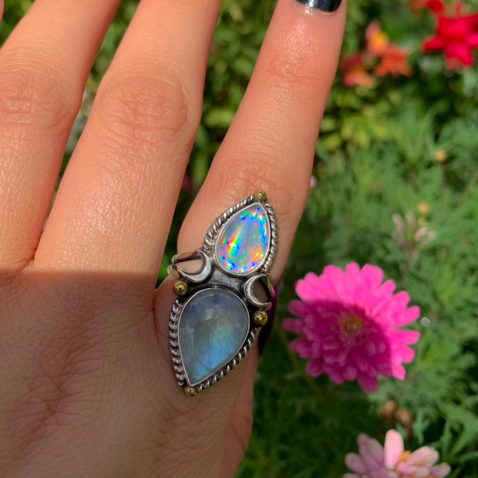 She features a beautiful Moonstone and a stunning teardrop shaped Angel Aura Quartz, both filled with the most incredible rainbows that flash across the gems in the light. Like all my work, this ring is a complete one of a kind, made using recycled silver, cruelty-free materials, ethically sourced crystals and environmentally friendly methods.
