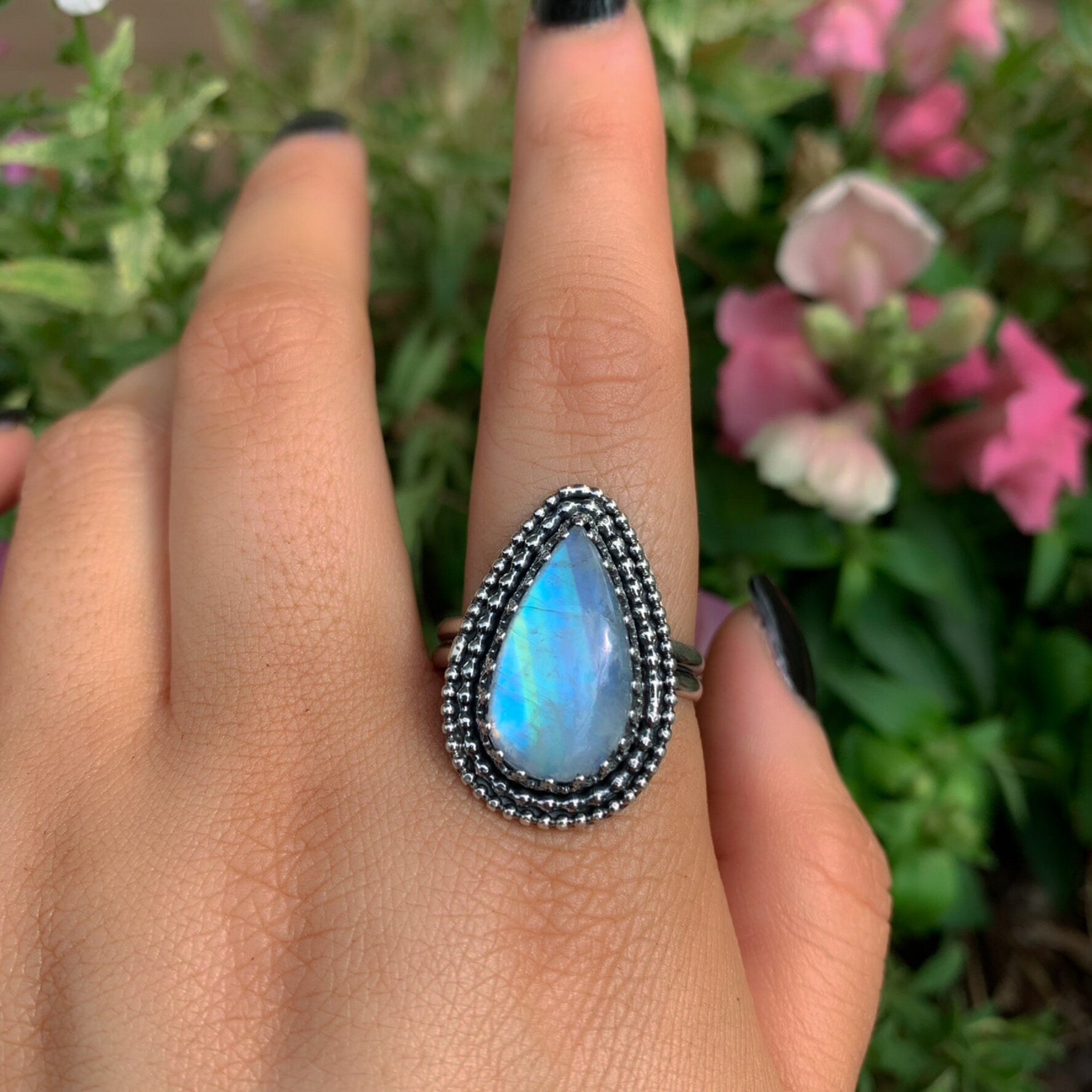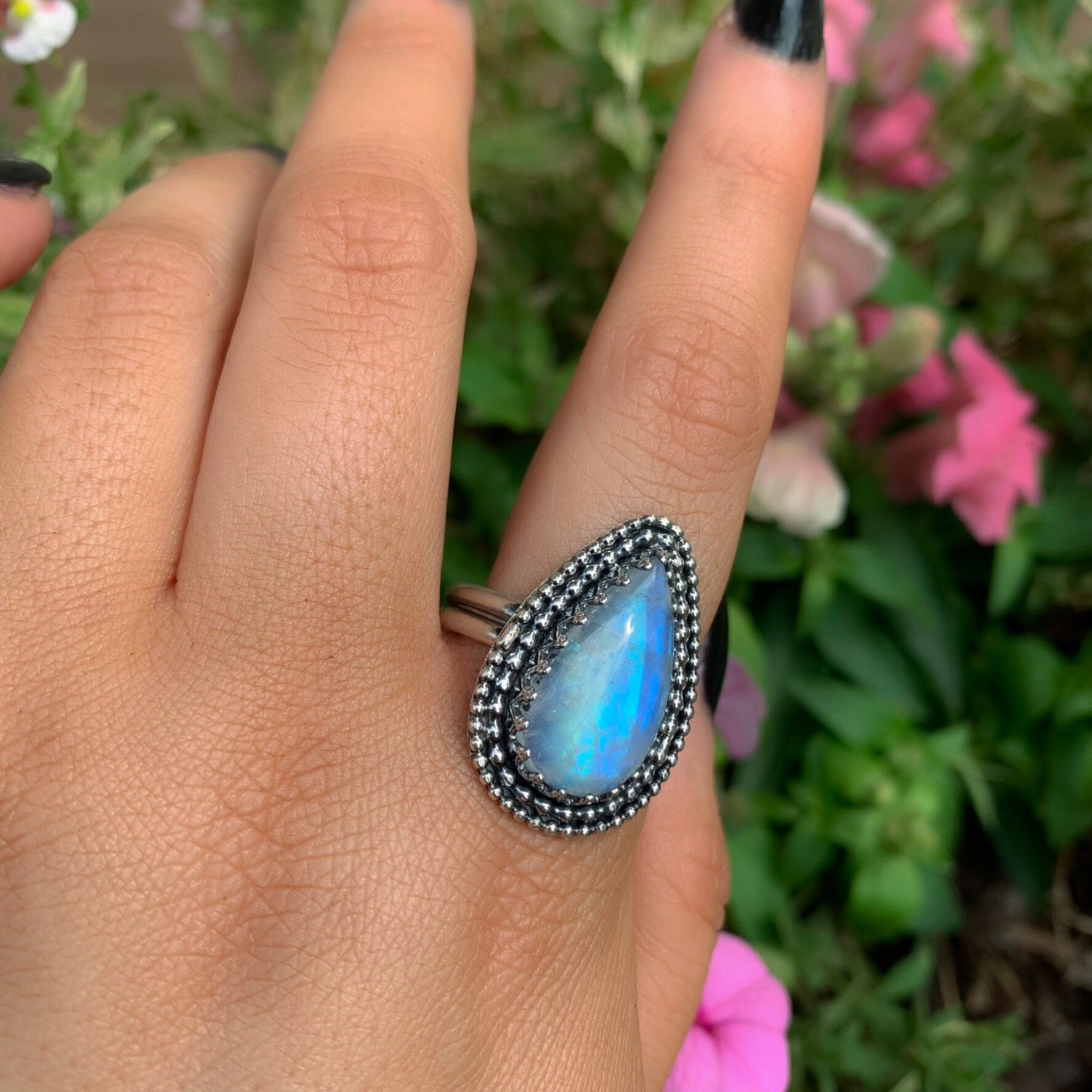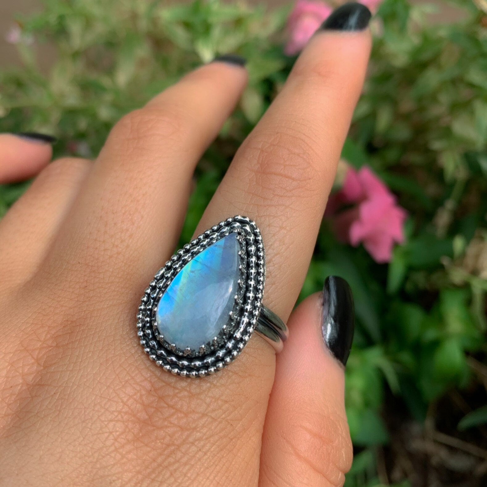This handcrafted ring features the most stunning piece of teardrop shaped Moonstone, filled with incredible rainbows that flash across it in the light. Like all my work, this ring is a complete one of a kind, made using recycled silver, cruelty-free materials, ethically sourced crystals and environmentally friendly methods.