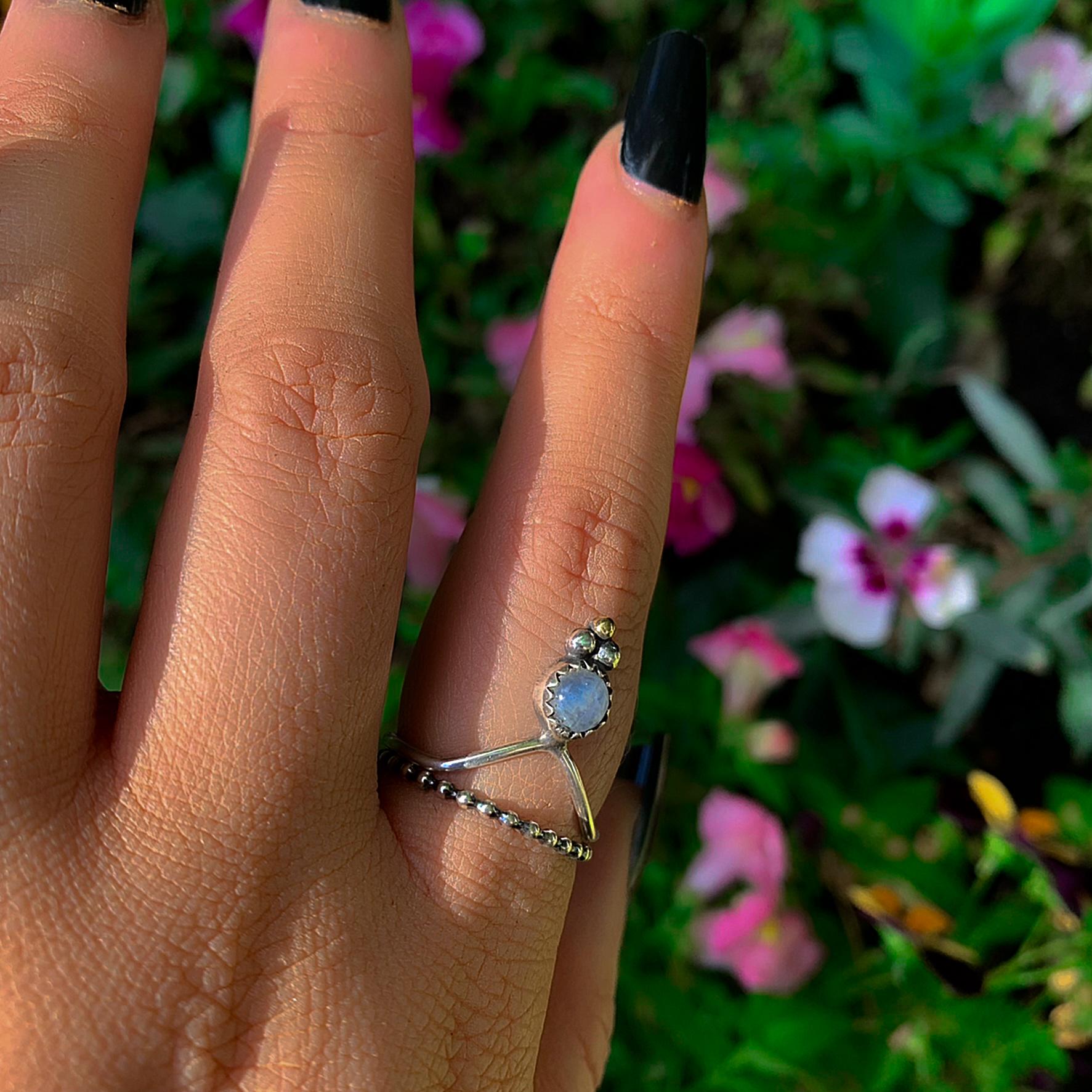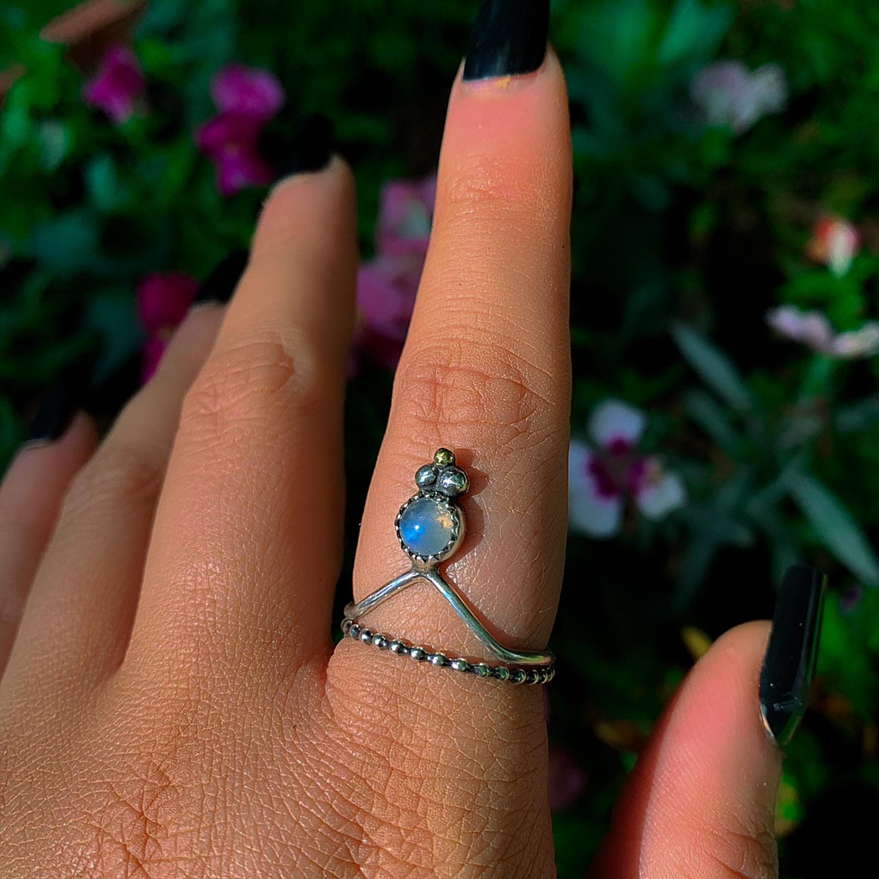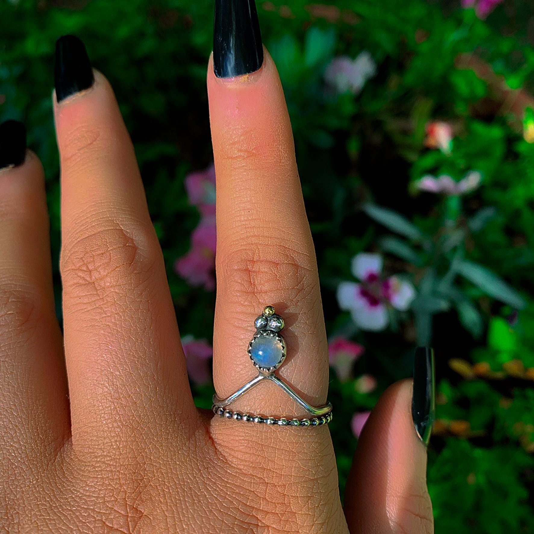 This ring brings the story to life through two stacking rings, one with a Moonstone that shimmers with ethereal flashes, like moonlight dancing across water. As with all my work, it is entirely one of a kind, handcrafted from recycled precious metals and created using cruelty-free practices, ethically sourced crystals, and environmentally conscious methods.