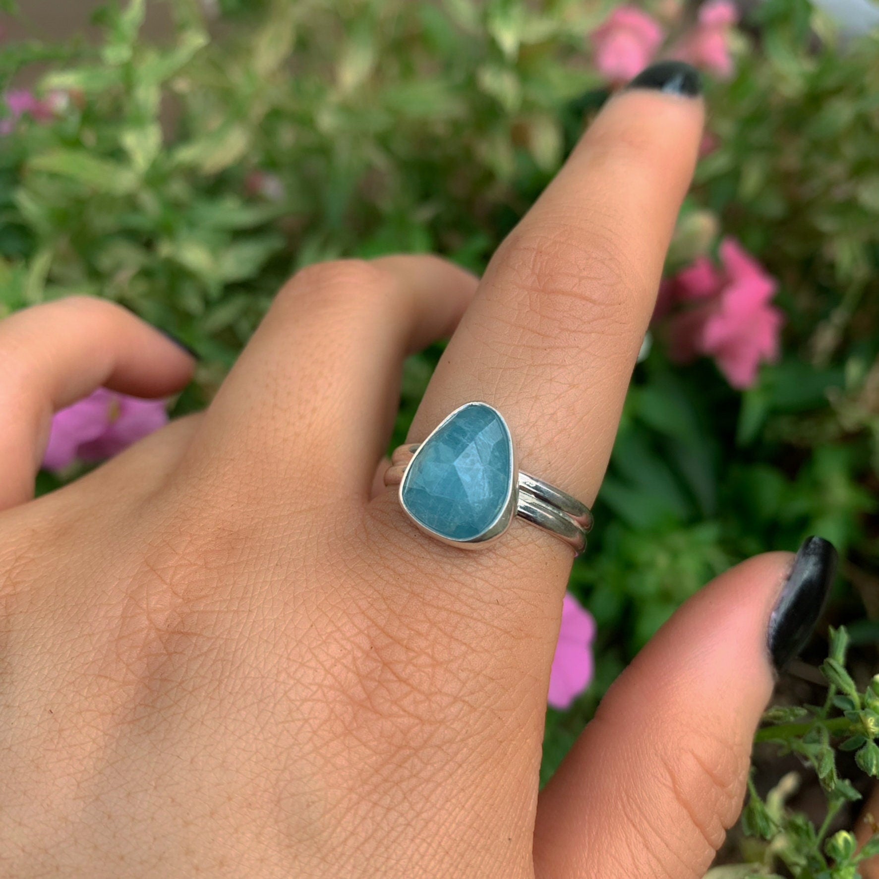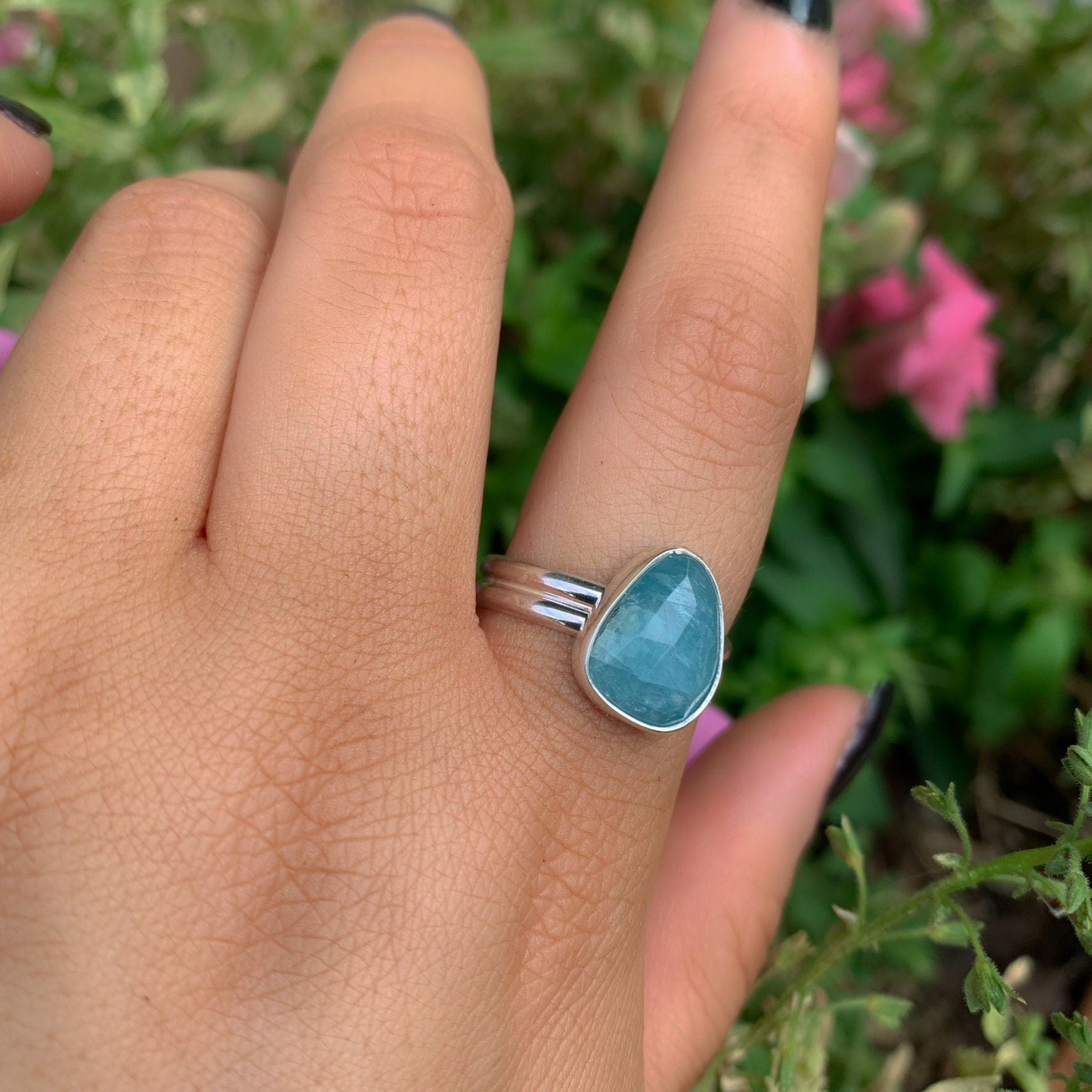 This handcrafted statement ring features a stunning rose cut Aquamarine that is the most luminous shade of blue. Like all my work, this ring is a complete one of a kind, made using recycled silver, cruelty-free materials, ethically sourced crystals and environmentally friendly methods.