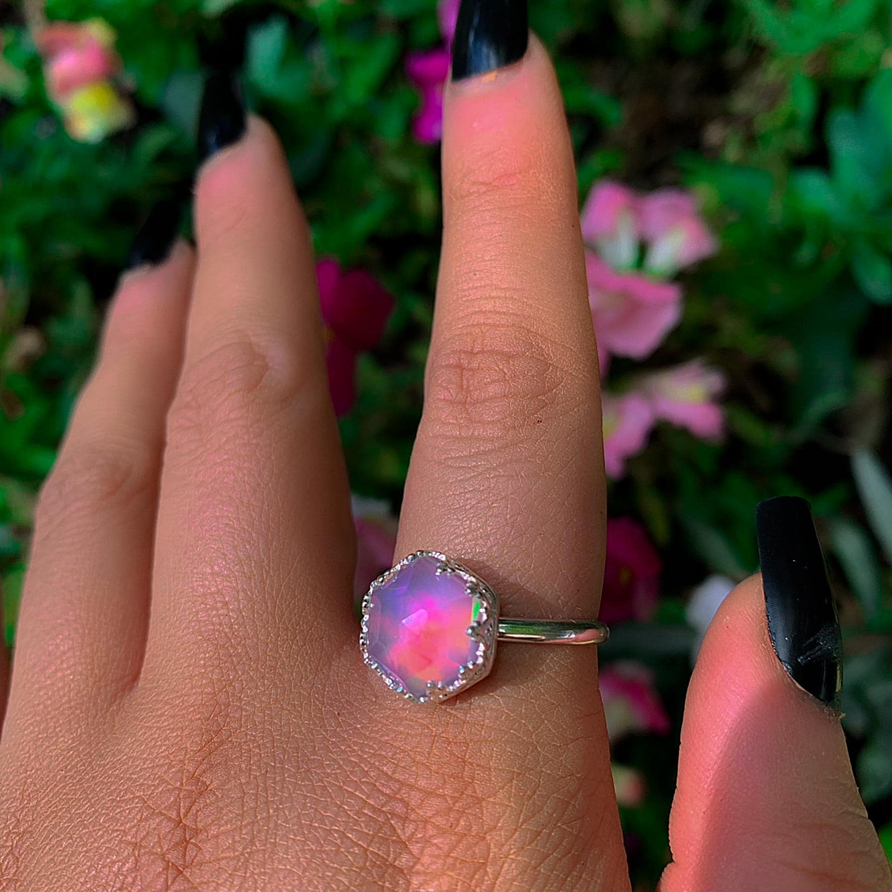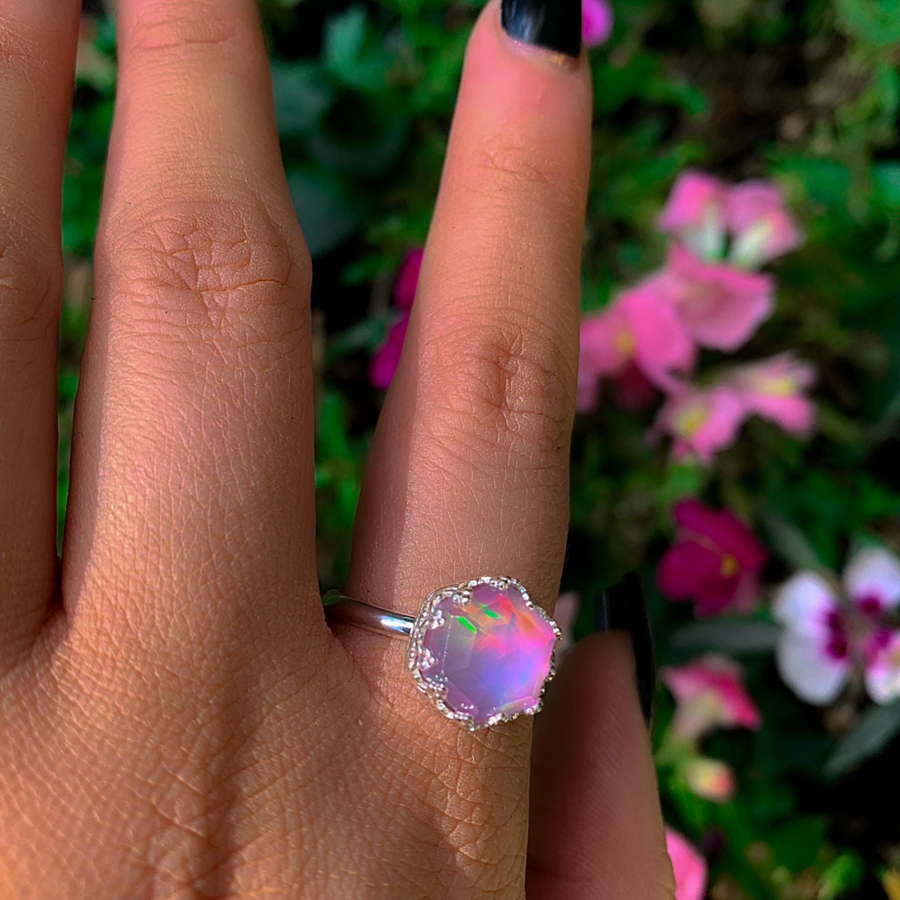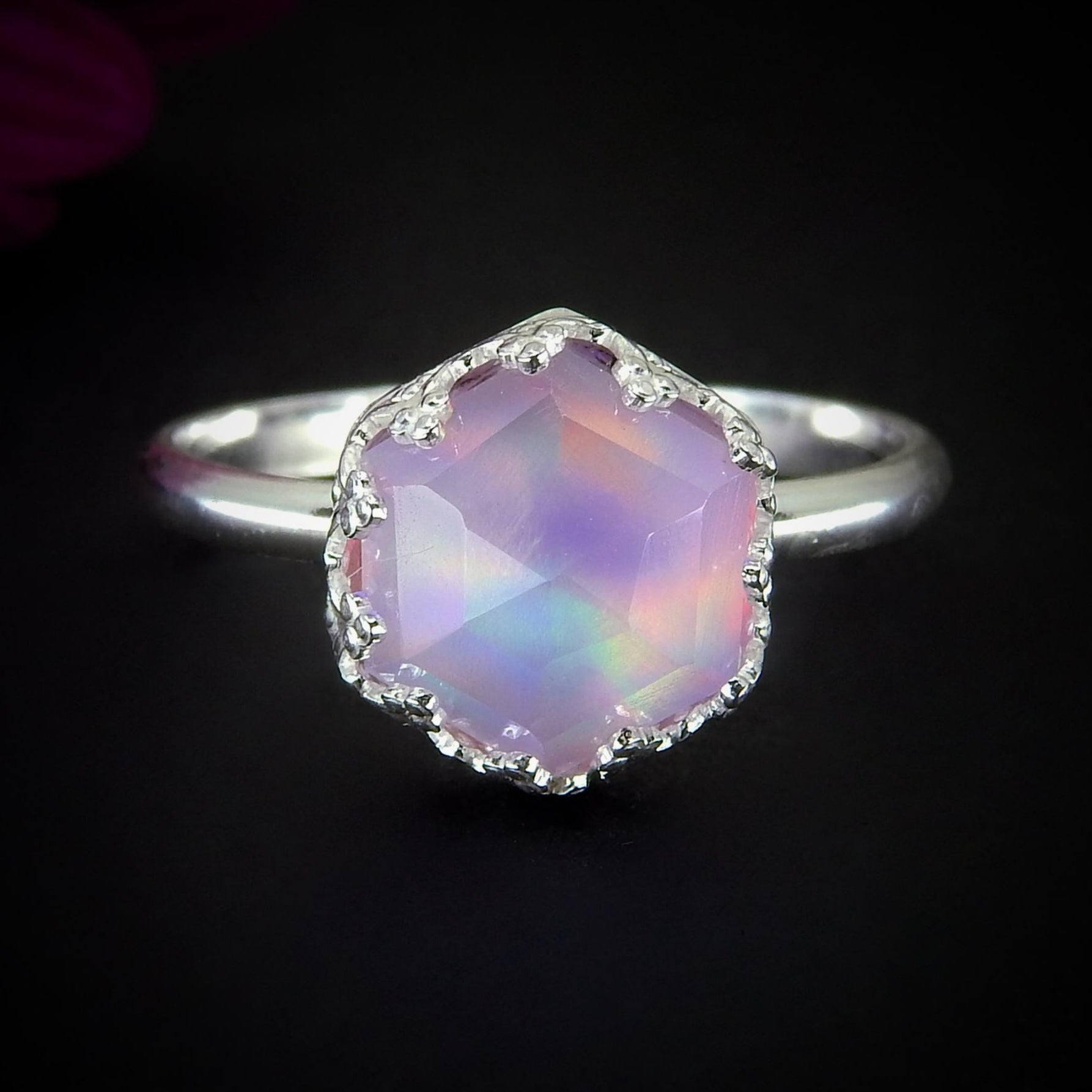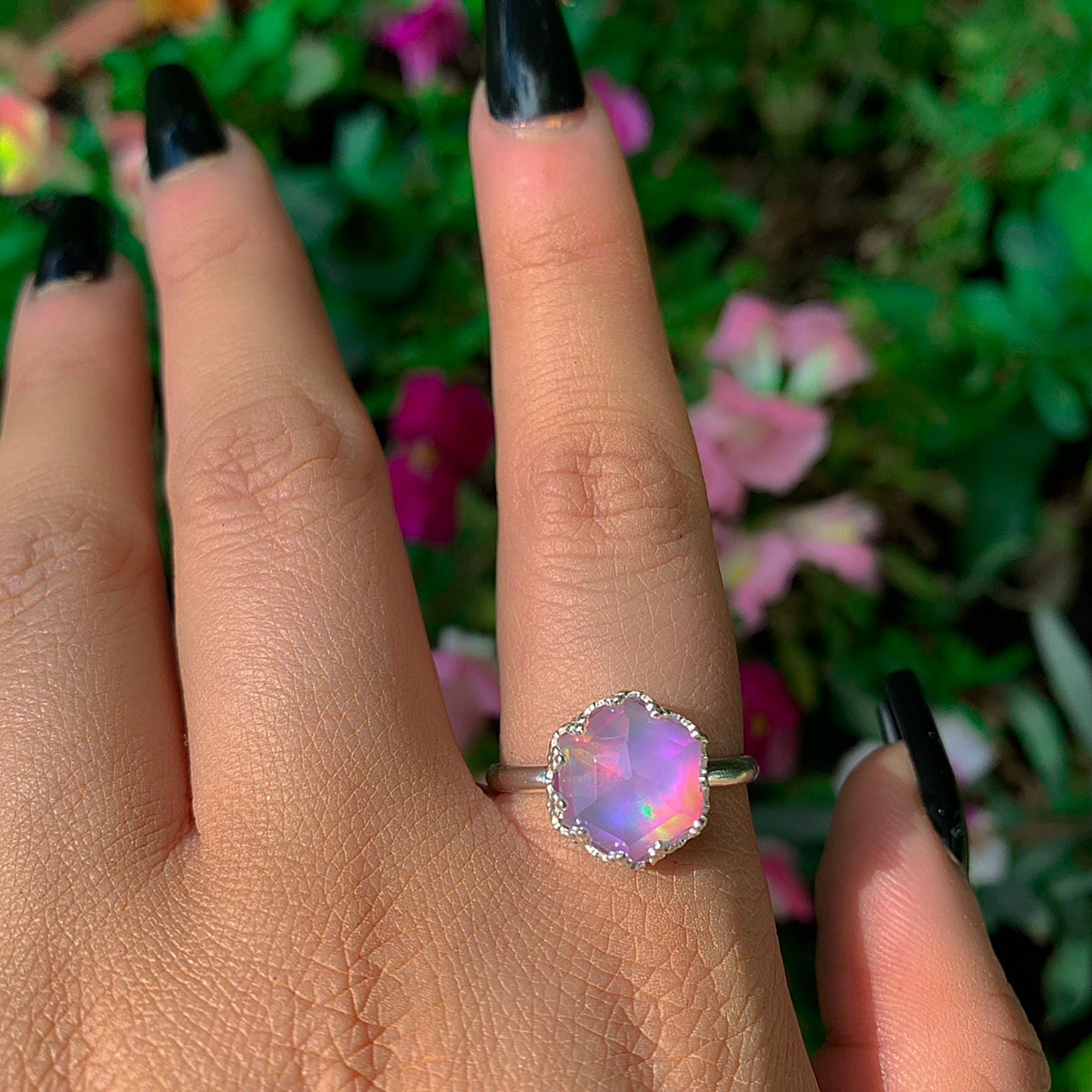 This handcrafted ring features a luminous rose-cut Himalayan Clear Quartz, resting above a dreamy rainbow Aurora Opal. As the ring moves, soft pastel colours shimmer through the quartz, dancing and shifting with every glimmer of light. Like all my creations, this piece is entirely one of a kind — made with recycled silver, ethically sourced crystals, cruelty-free materials, and mindful, eco-conscious methods.