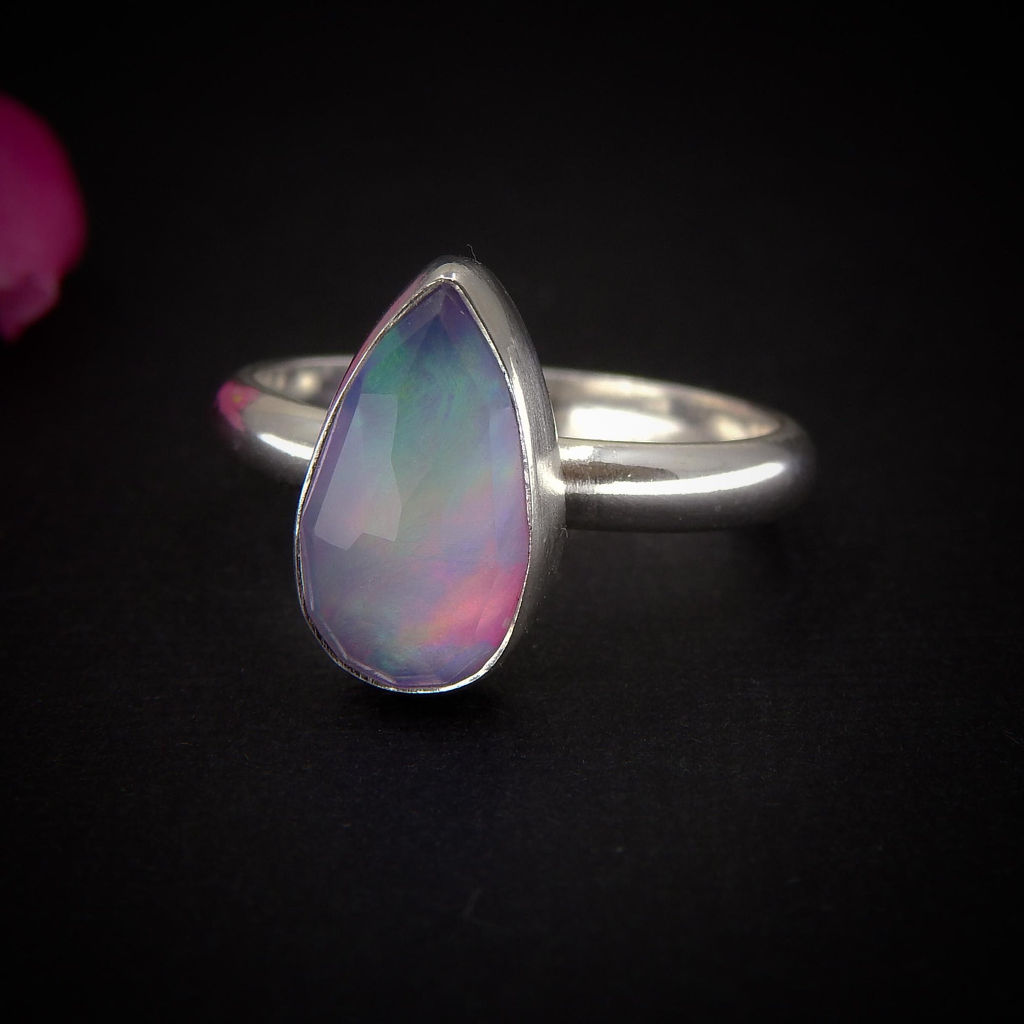 She features a stunning rose cut Himalayan Clear Quartz that sits above a beautiful rainbow Aurora Opal. The pastel colours in the Aurora Opal shine through the Quartz, shimmering and changing through its facets when the ring moves. Like all my work, this ring is a complete one of a kind, made using recycled silver, cruelty-free materials, ethically sourced crystals and environmentally friendly methods.