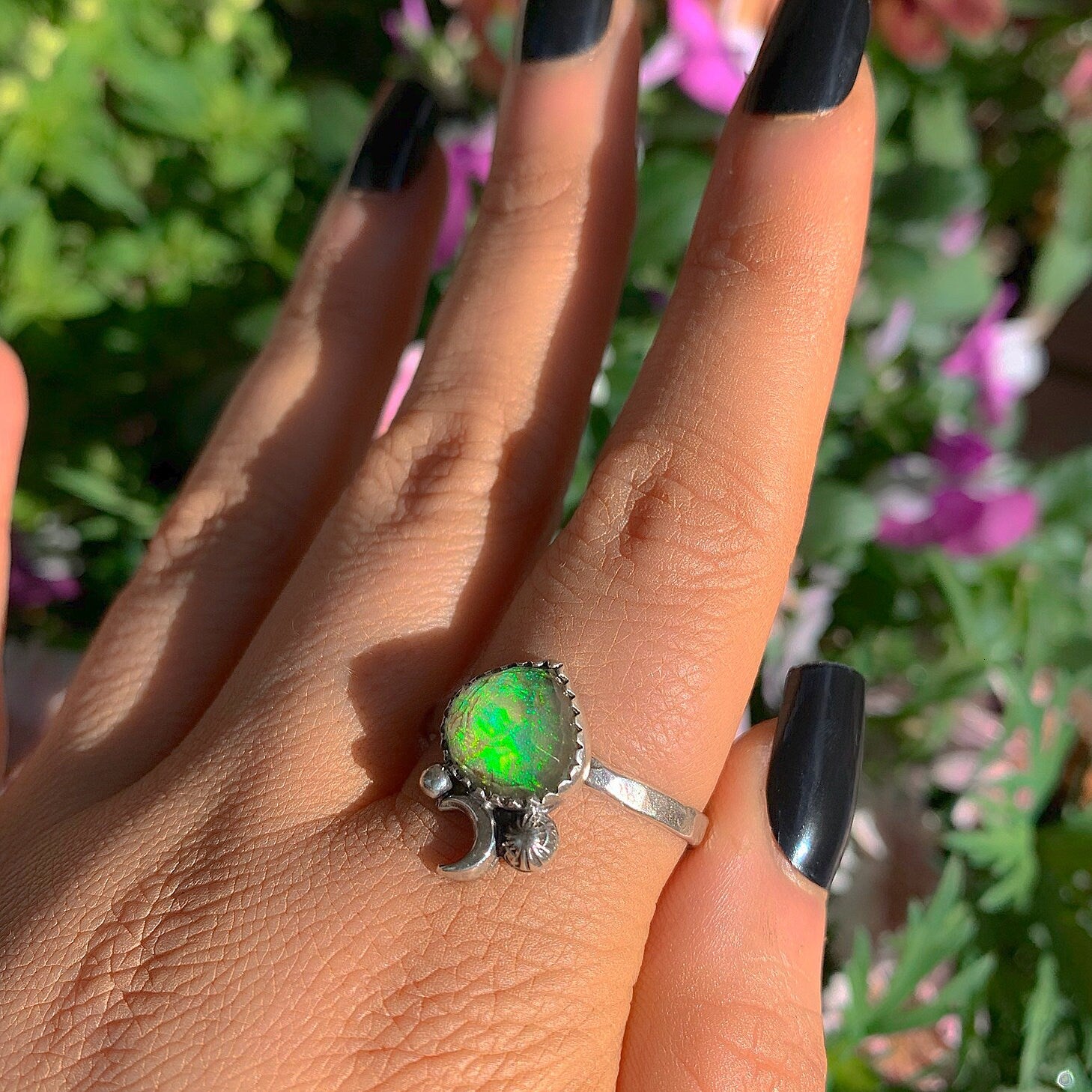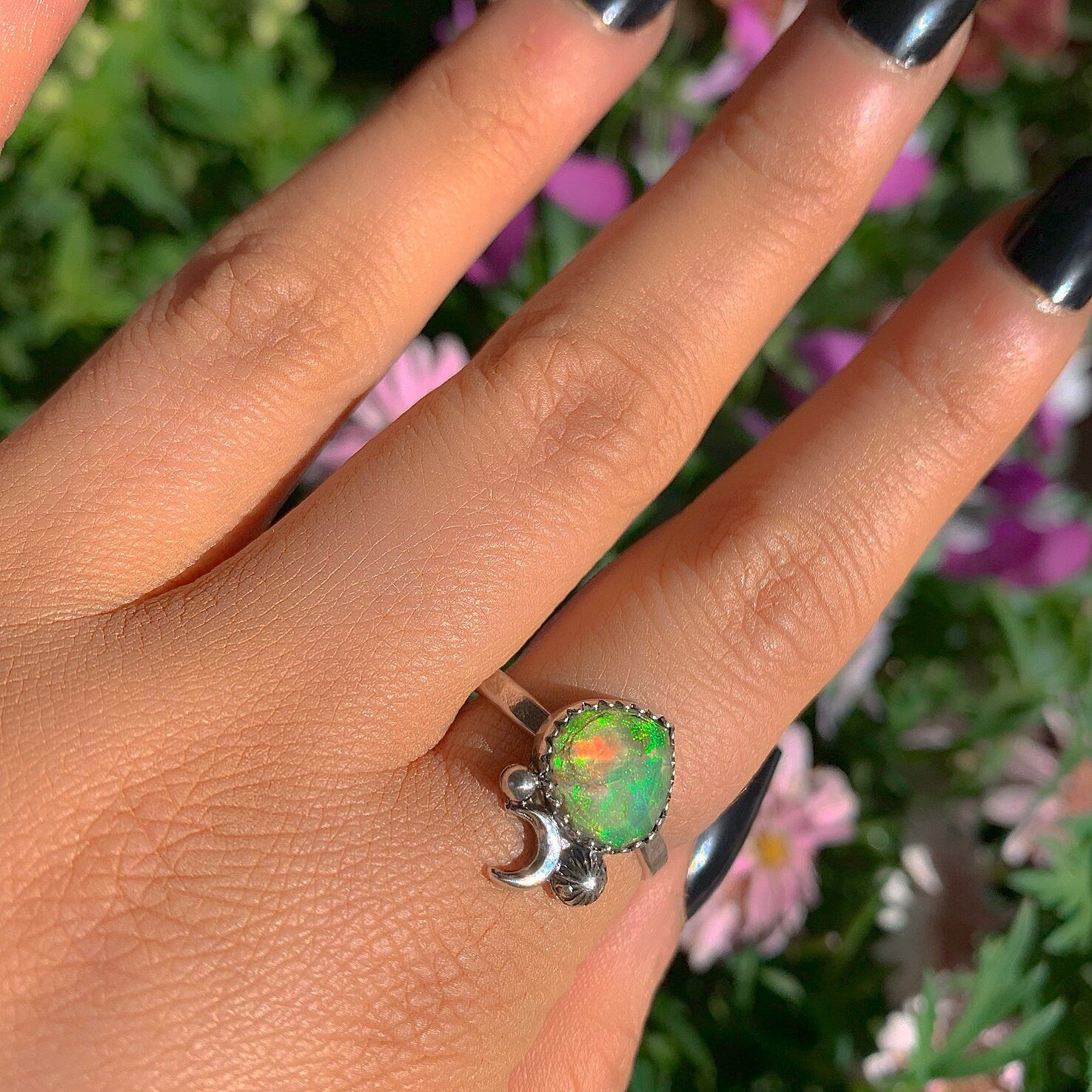 This handcrafted ring features a beautiful piece of rose cut Himalayan Clear Quartz that sits above a slice of pastel rainbow Monarch Opal, allowing the colours from the Opal to shine through the quartz and change colour in the most magical way depending on where the light hits the stone. Like all my work, this ring is a complete one of a kind, made using recycled silver, cruelty-free materials, ethically sourced crystals and environmentally friendly methods.