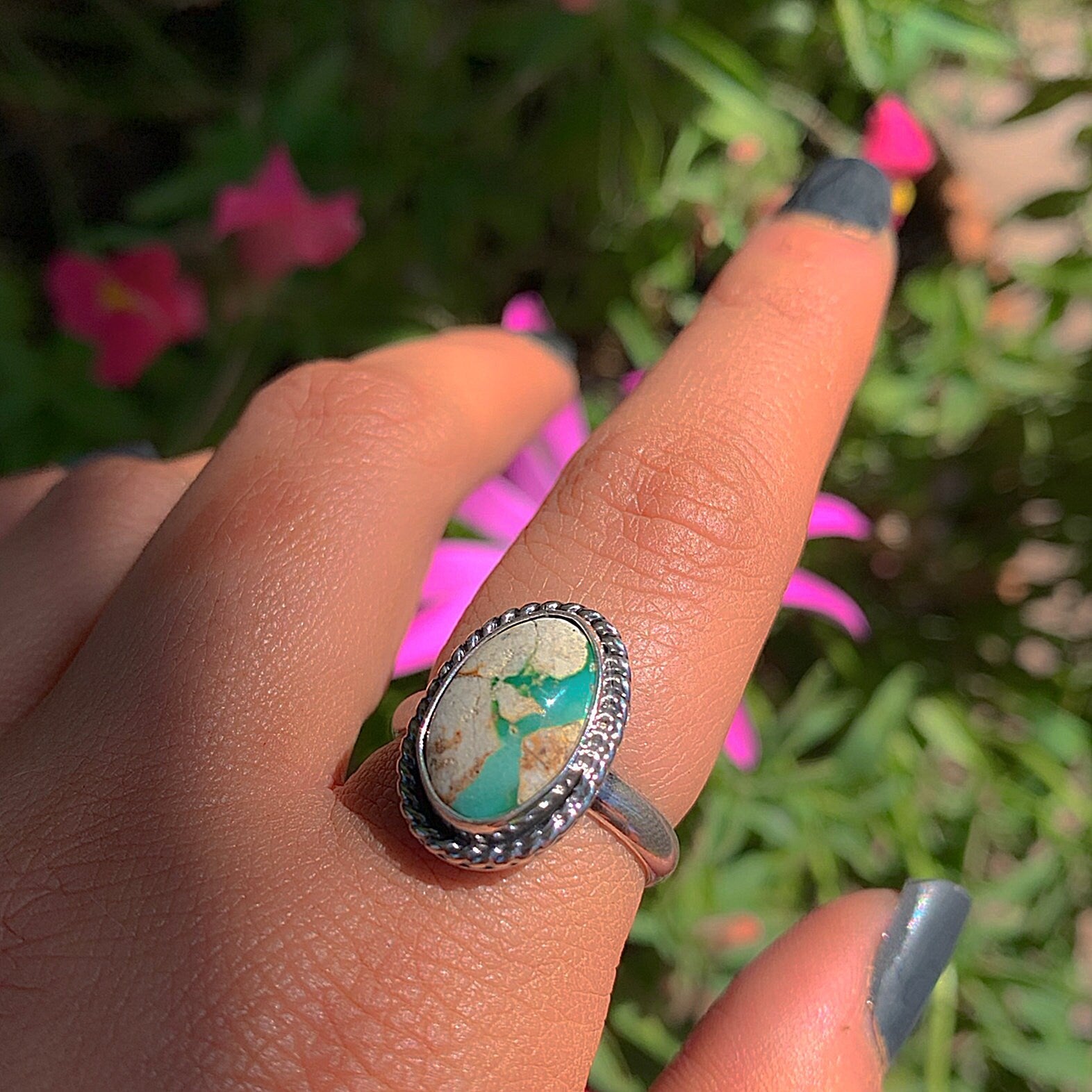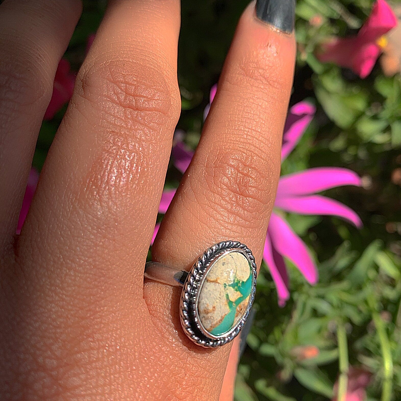 This handcrafted ring features a beautiful piece of Stone Mountain Ribbon Turquoise, with a stunning stream of aqua and teal Turquoise that runs through the host rock. Like all my work, this ring is a complete one of a kind, made using recycled silver, cruelty-free materials, ethically sourced crystals and environmentally friendly methods.