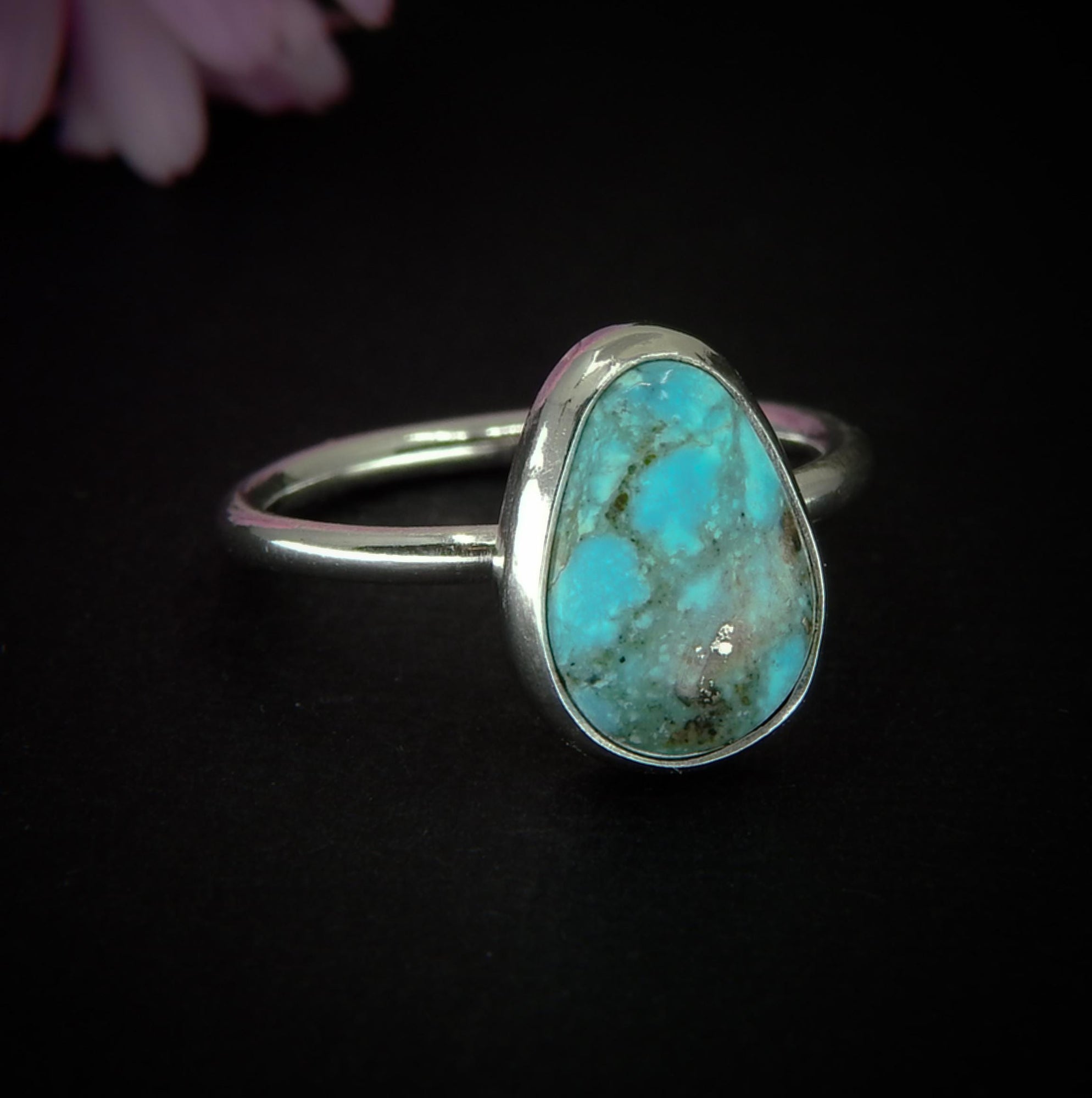 This handcrafted ring is part of the Persephone's Return collection; a small gathering of jewels that pay homage to the shifting seasons, inspired either by the quiet end of Winter or the bright beginning of Spring. It features a beautifl piece of genuine White Water Turquoise, with vibrant blue swirls set against delicate accents of caramel, grey, and white. Like all my work, this ring is completely one of a kind, crafted with recycled silver, cruelty-free materials, ethically sourced crystals, and environmentally friendly methods.