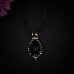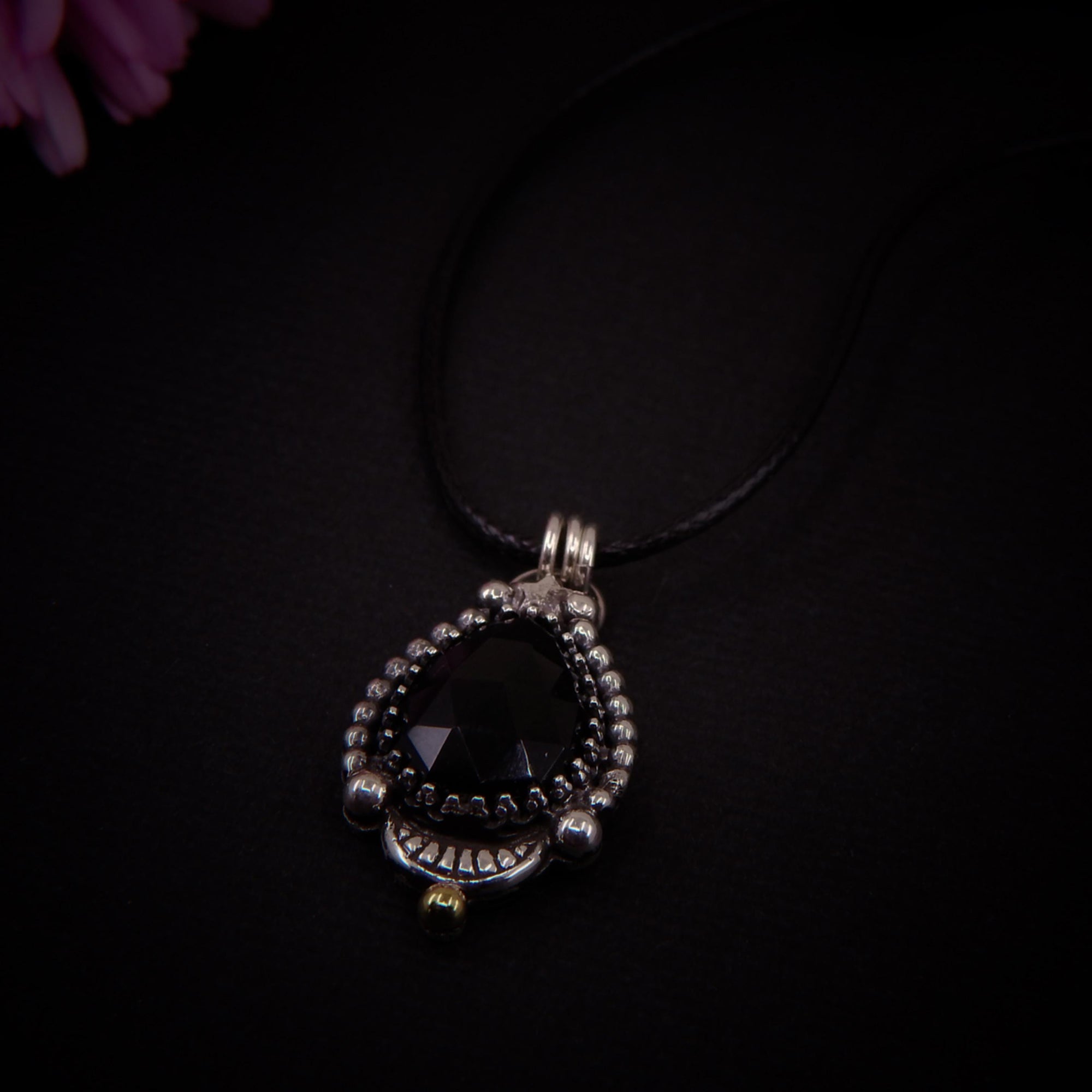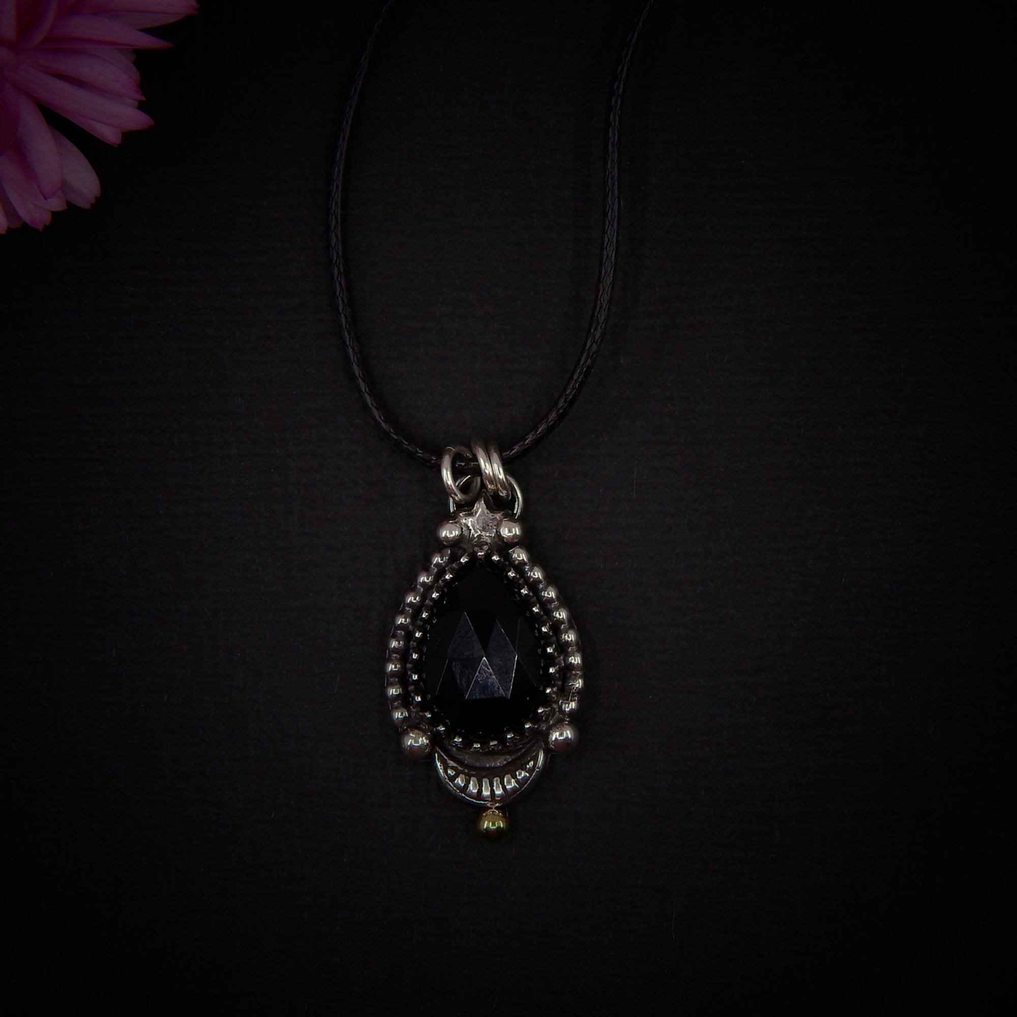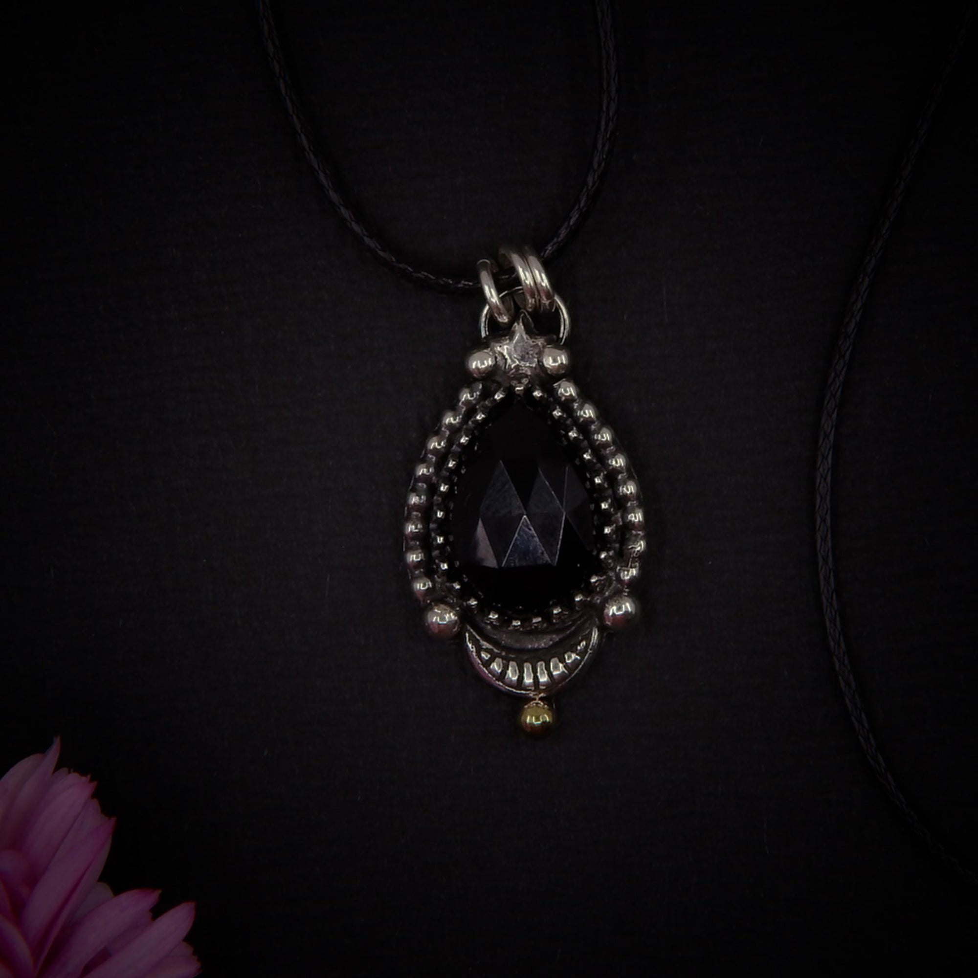 This handcrafted pendant features a beautiful rose cut Black Onyx whose facets bounce light as if mimicking stars in a midnight Winter sky. As with all my work, it is entirely one of a kind, handcrafted from recycled precious metals and created using cruelty-free practices, ethically sourced crystals, and environmentally conscious methods.