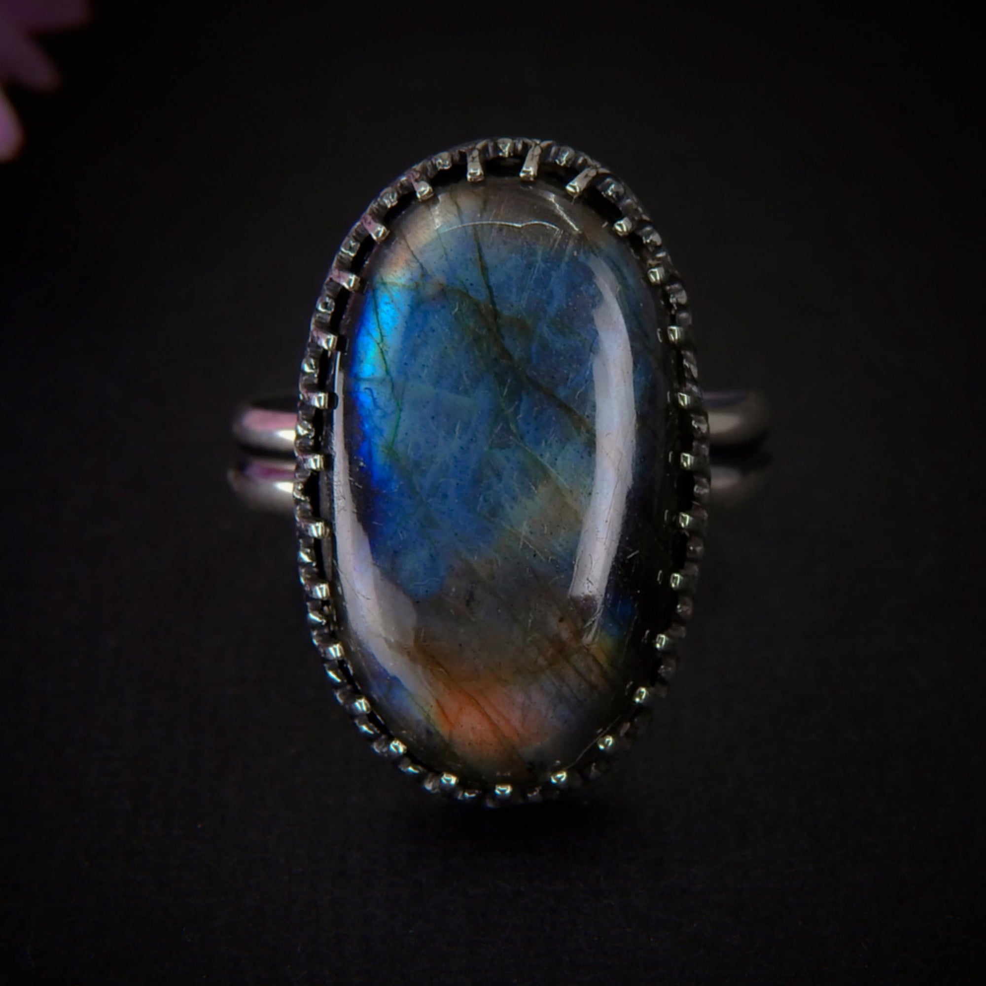 This handcrafted ring features a beautiful piece of Labradorite with the most incredible flashes of colour that dance across the stone in the light. Like all my work, this ring is a complete one of a kind, made using recycled silver, cruelty-free materials, ethically sourced crystals and environmentally friendly methods.