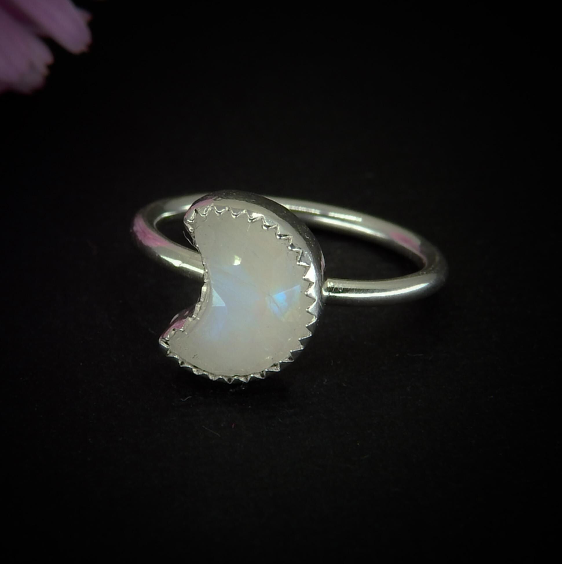 This handcrafted ring is part of the Persephone's Return collection; a small gathering of jewels that pay homage to the shifting seasons, inspired either by the quiet end of Winter or the bright beginning of Spring. It features a stunning crescent moon shaped Moonstone that has the most beautiful rainbow flash in the light. Like all my work, this ring is a complete one of a kind, made using recycled silver, cruelty-free materials, ethically sourced crystals and environmentally friendly methods.