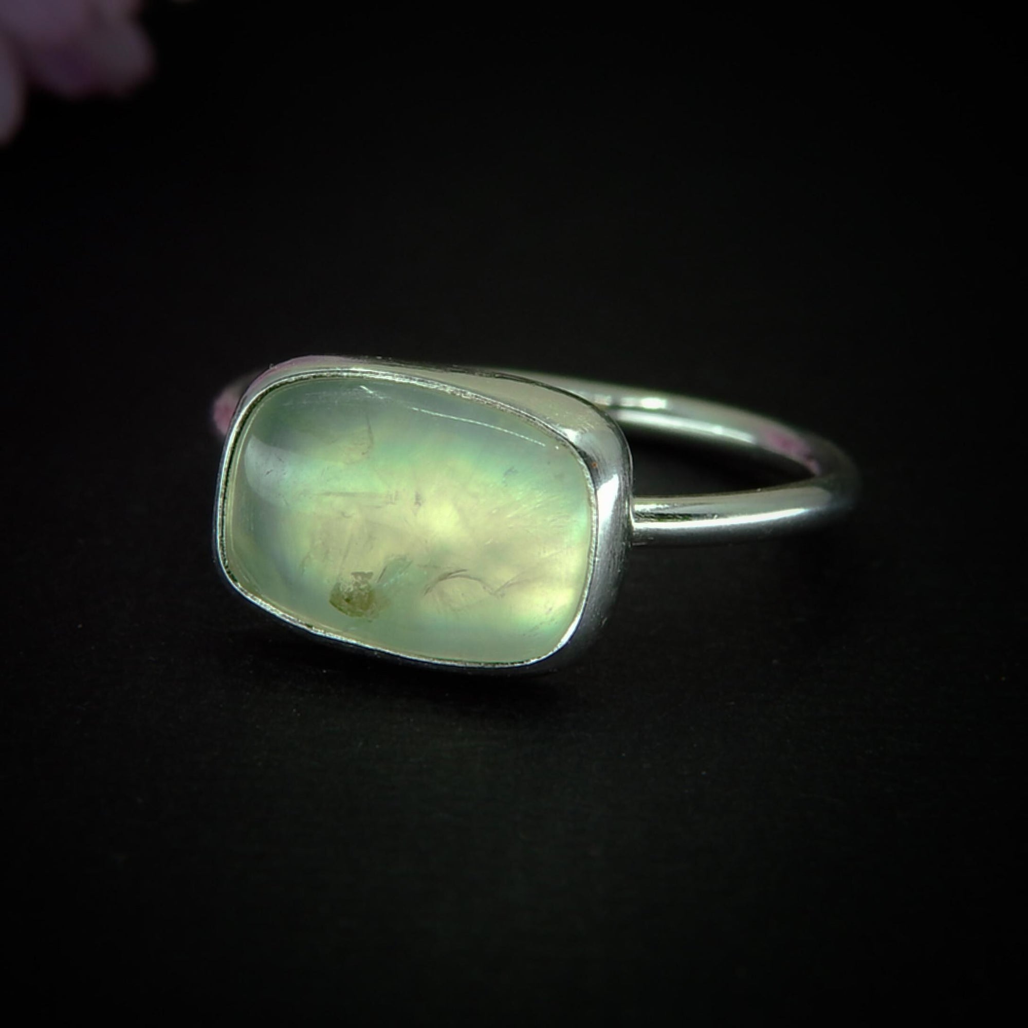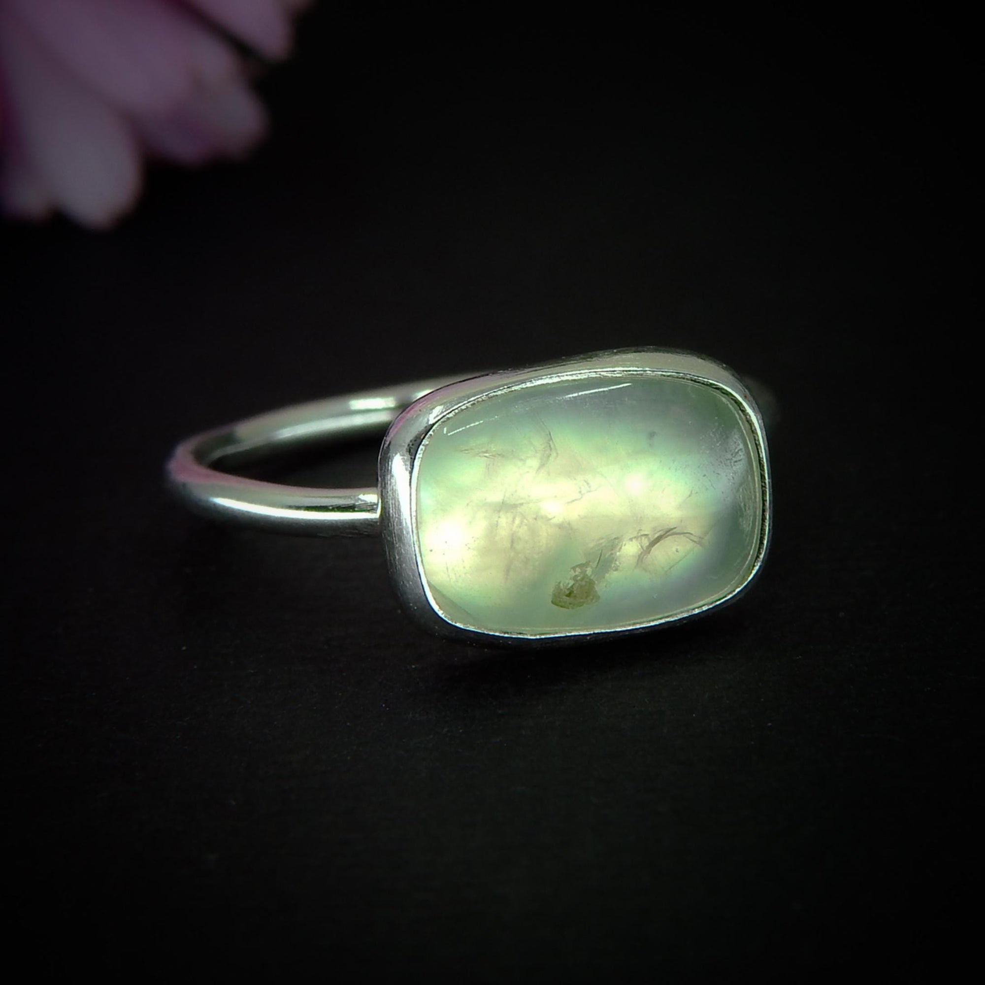 This handcrafted ring is part of the Persephone's Return collection; a small gathering of jewels that pay homage to the shifting seasons, inspired either by the quiet end of Winter or the bright beginning of Spring. It features a stunning rectangular-shaped Prehnite that is the most luminous sea-foam green colour. Like all my work, this ring is a complete one of a kind, made using recycled silver, cruelty-free materials, ethically sourced crystals and environmentally friendly methods.