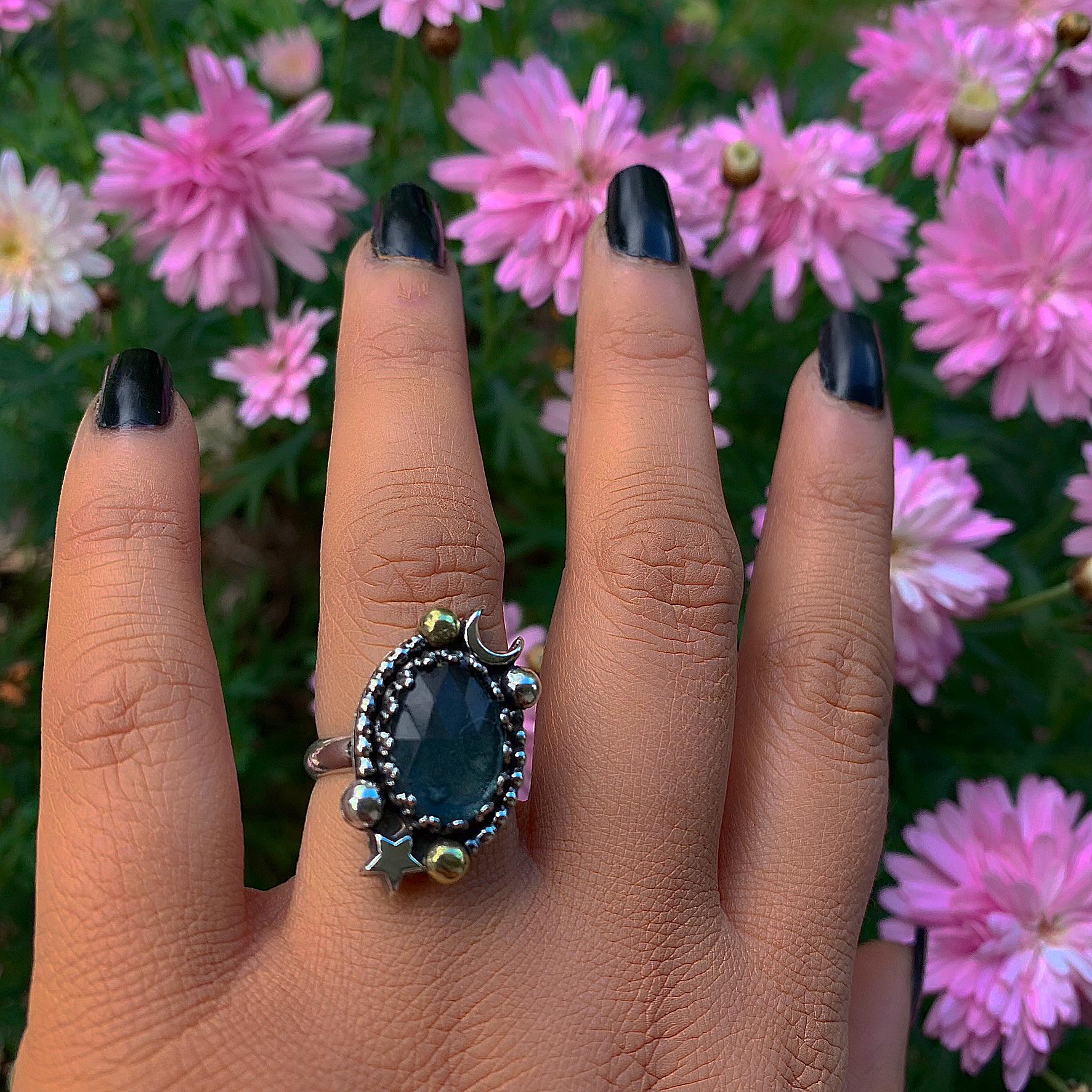 This handcrafted ring features a beautiful piece of rose cut Fluorite that shimmers with different shades of dusky-teal and blue in the light. Like all my work, this ring is a complete one of a kind, made using recycled silver, cruelty-free materials, ethically sourced crystals and environmentally friendly methods.