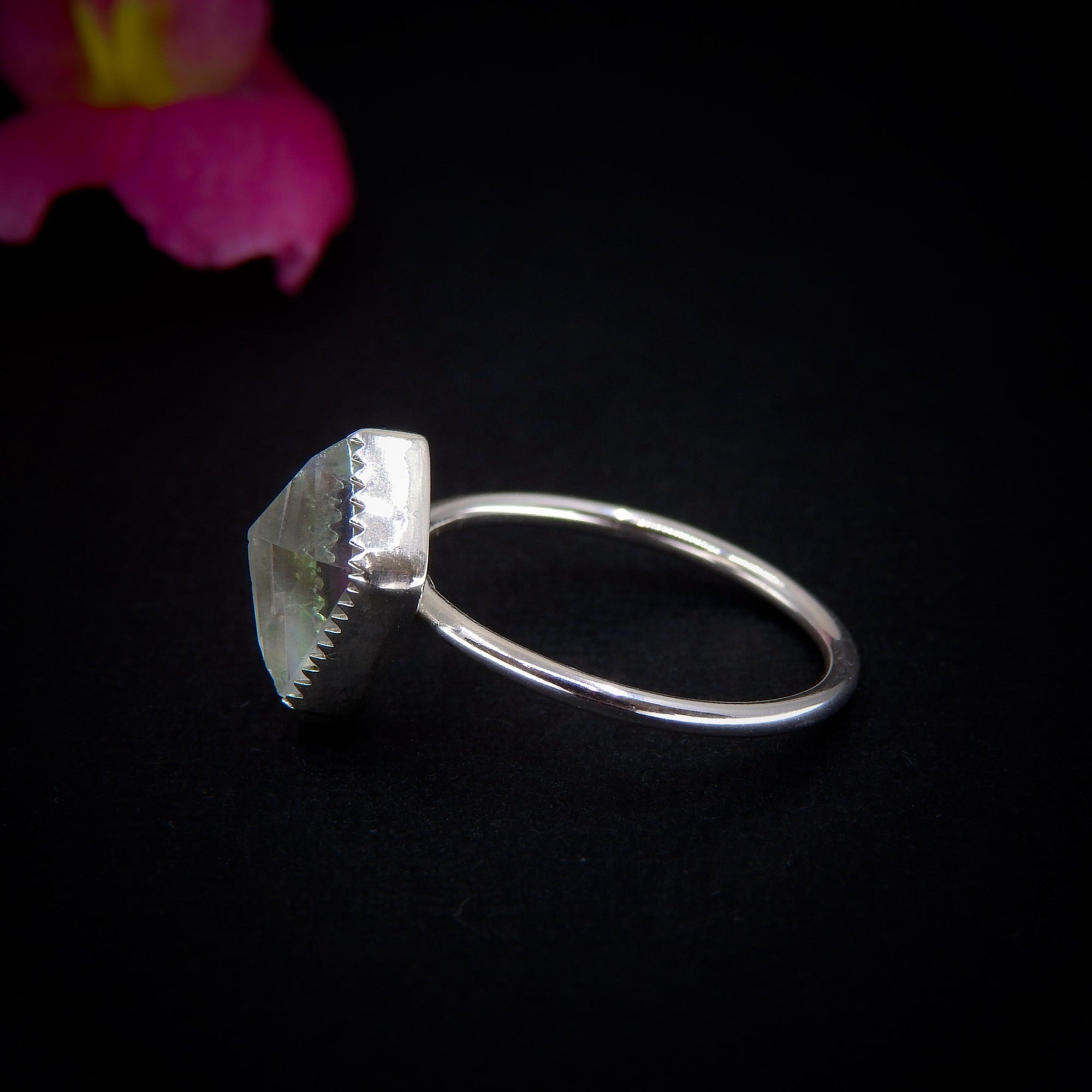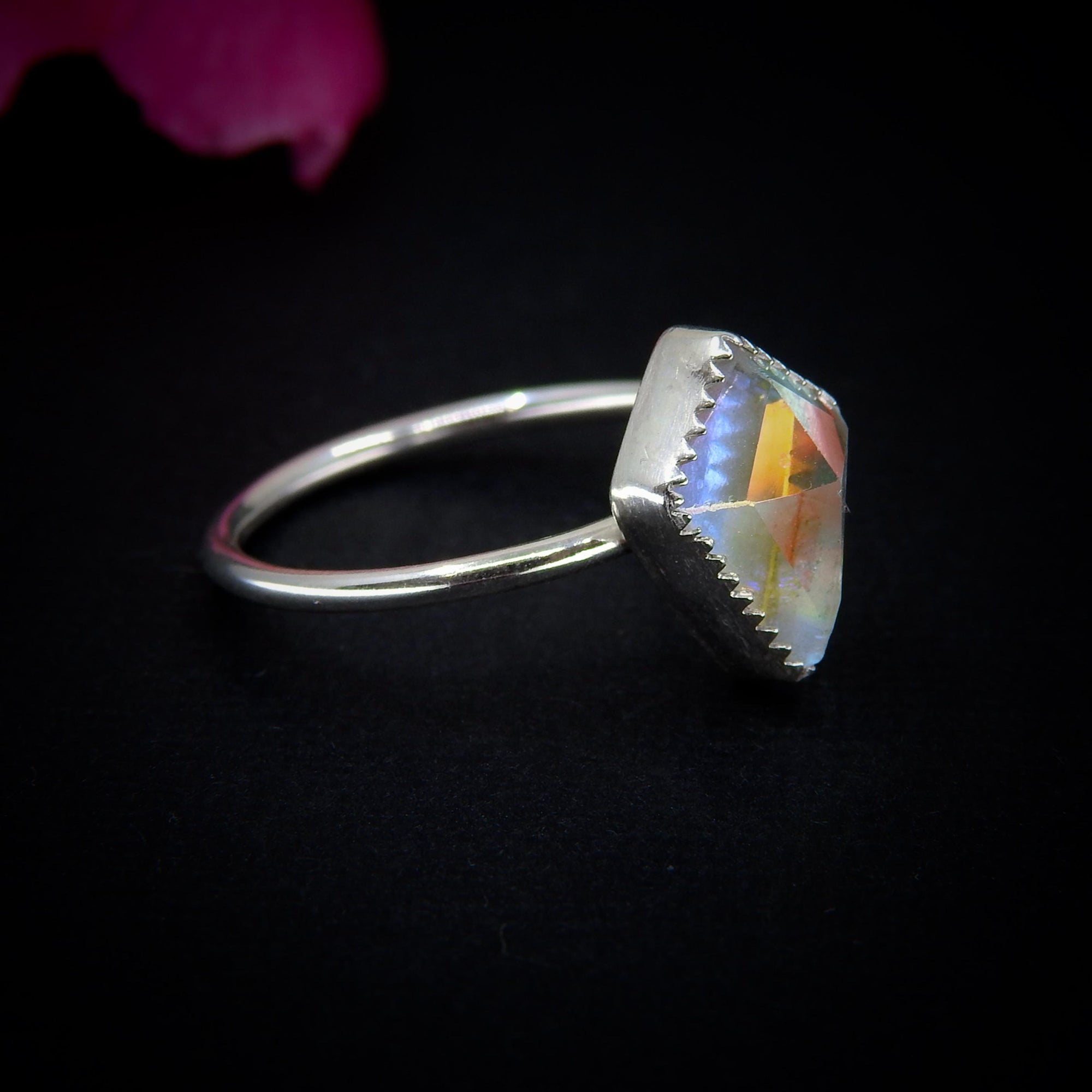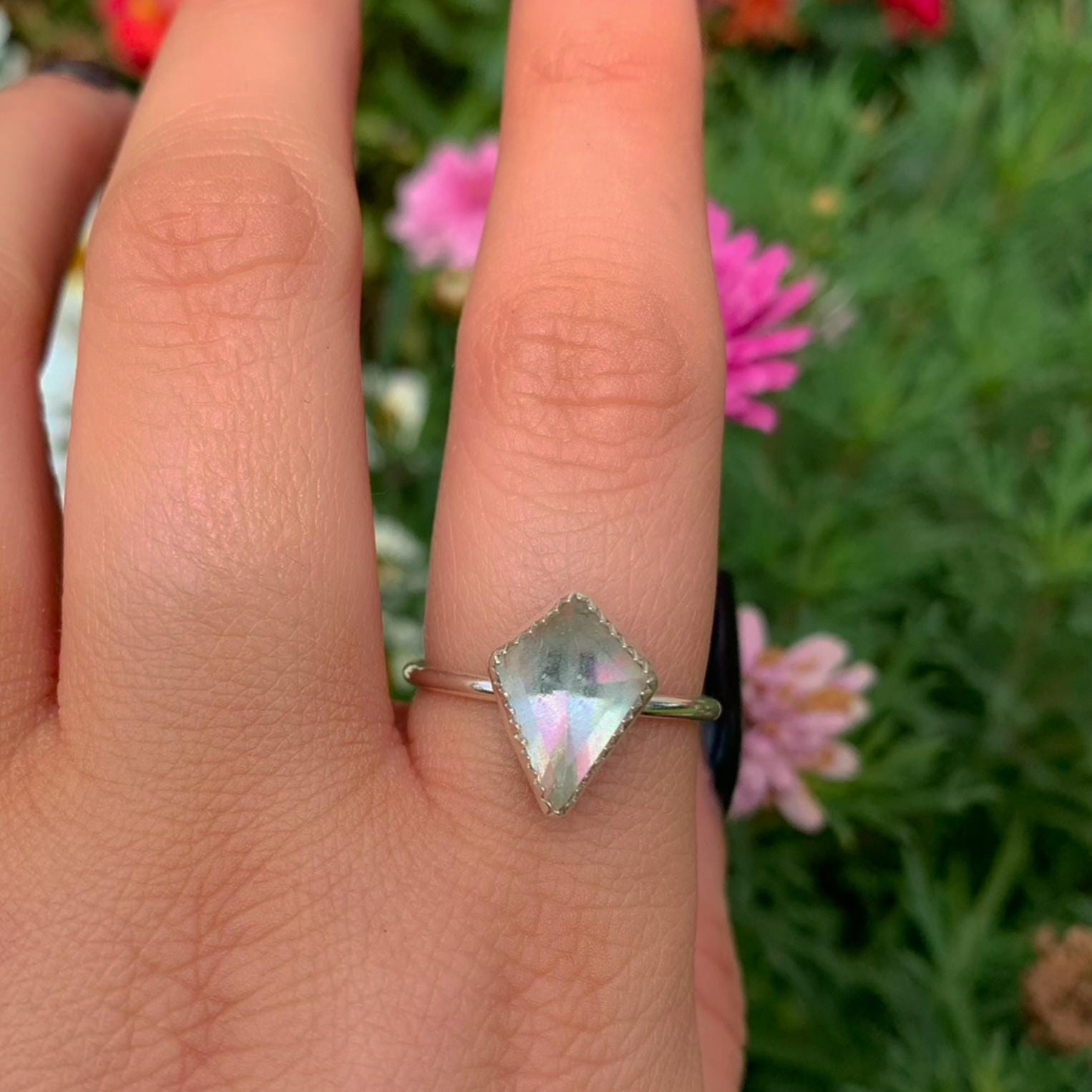She features a beautiful piece of kite-shaped Angel Aura Quartz, with the loveliest rainbow that shimmer across the stone when it moves. Like all my work, this ring is a complete one of a kind, made using recycled silver, cruelty-free materials, ethically sourced crystals and environmentally friendly methods.