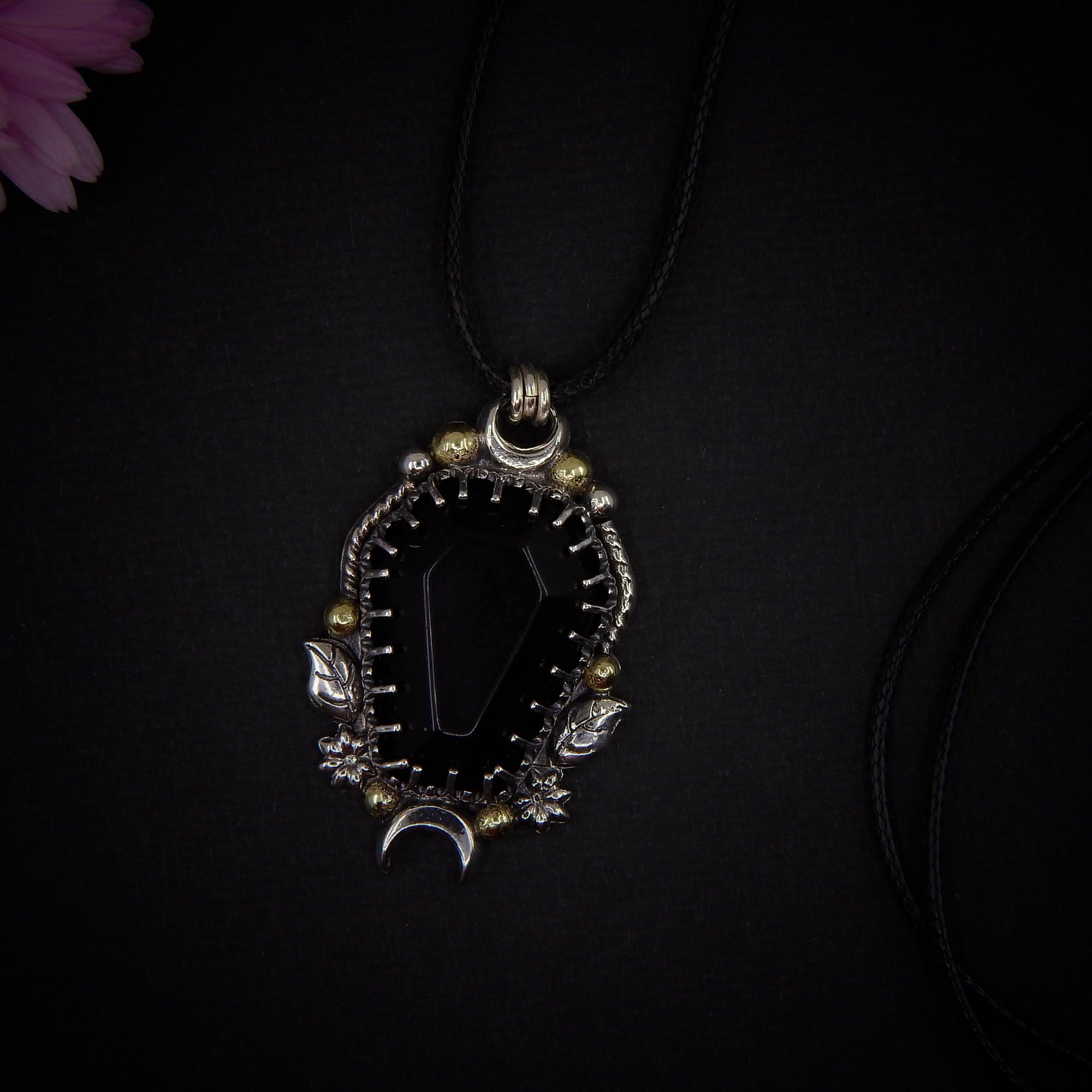 This handcrafted pendant hails from the Nocturne collection, a gathering of treasures wrought in honour of Halloween’s spell, where darkness and beauty entwine beneath the veil of night. It features a beautiful Black Onyx carved into its coffin shape, reflecting the light like the shimmer of the moon against the midnight sky. Named for Glitonea, the keeper of night’s hidden realms. Like her, this piece whispers of mystery, flight, and beauty found only beneath the darkened sky. Like all my work, it is a complete one of a kind, made using recycled silver, cruelty-free materials, ethically sourced stones and environmentally friendly methods.